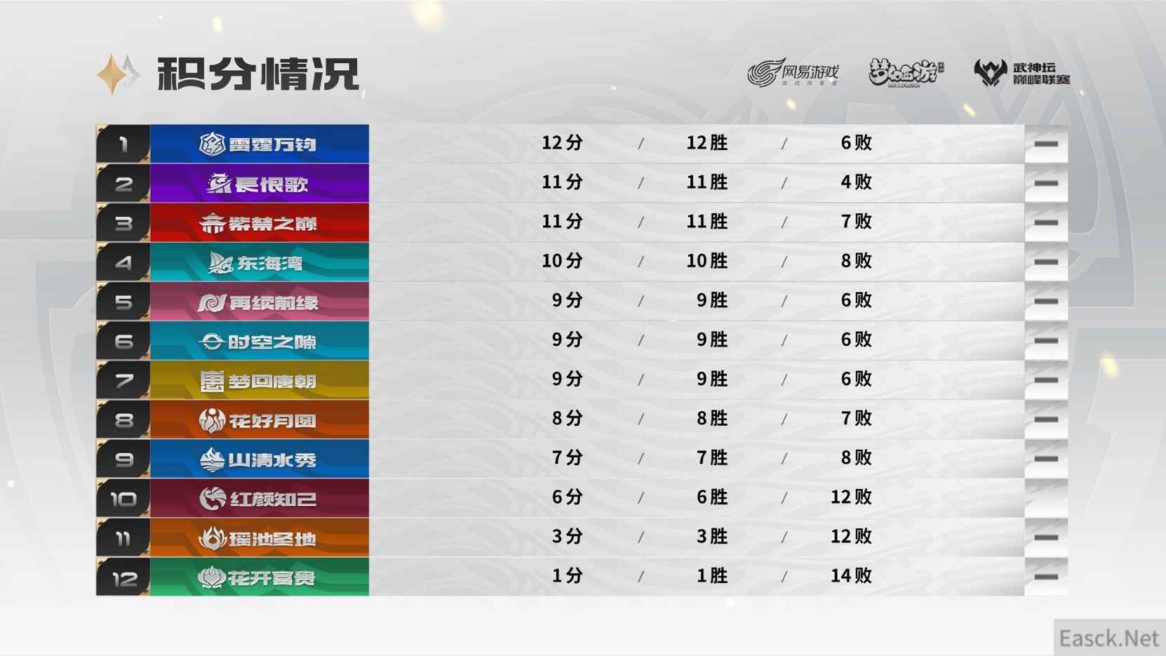 战火蔓延至第四周,积分排行榜迎来新一轮的反转:【雷霆万钧】以12胜6负的战绩冲上榜首、【长恨歌】11胜4负与【紫禁之巅】11胜7负分别位列榜眼探花,紧随其后的是【东海湾】、【再续前缘】、【时空之隙】、【梦回唐朝】、【花好月圆】霸榜前八,【山清水秀】、【红颜知己】、【瑶池圣地】以及【花开富贵】还在蓄力,静候爆发。第四周出现了什么精彩看点?各大战队如何扭转积分局面?马上与你一同回顾!