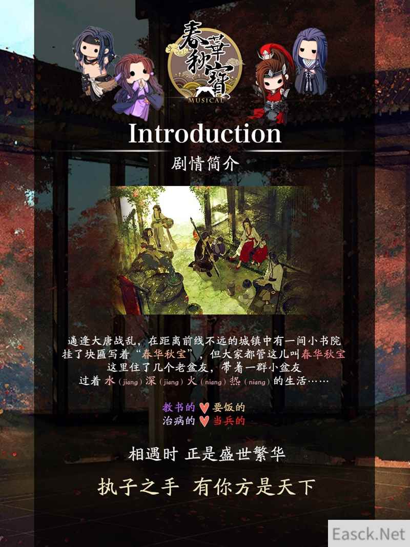 ▲《春华秋宝》剧情简介 《春华秋宝》改编自古风插画师伊吹五月的人气剑网3同人漫画《山河人间》,由知名COS团山海纪倾情演绎,讲述了大唐战乱期间,在一家名为“春华秋宝”的小书院里几个老朋友之间的故事,呈现一个豪情恣意、万将守护的大唐与有血有肉有情义的江湖。