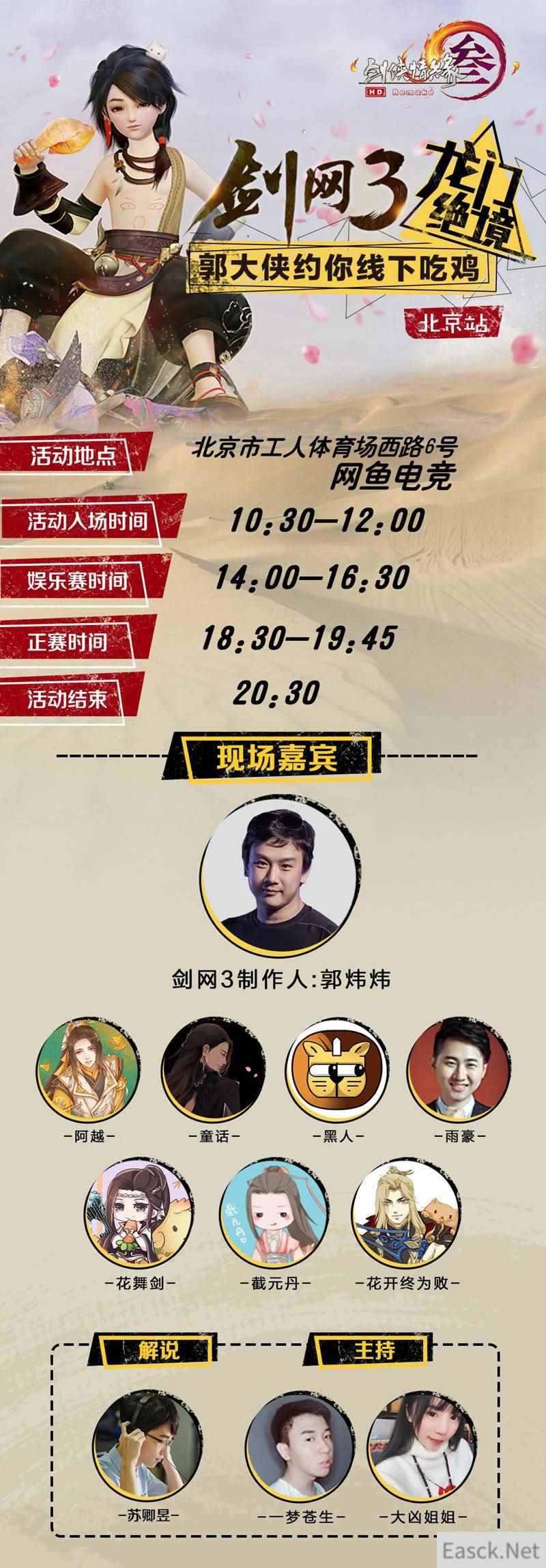 本次活动将由一梦苍生和大凶姐姐主持,苏卿昱解说,活动现场不仅将有众多COSER与各位玩家互动,还有诸位大家耳熟能详的主播阿越、童话、黑人、雨豪、花舞剑、截元丹、花开终为败等也将在现场亮相。郭大侠也将亲自带队参赛,想要与郭大侠一较高下的话,可不要错过机会哦!