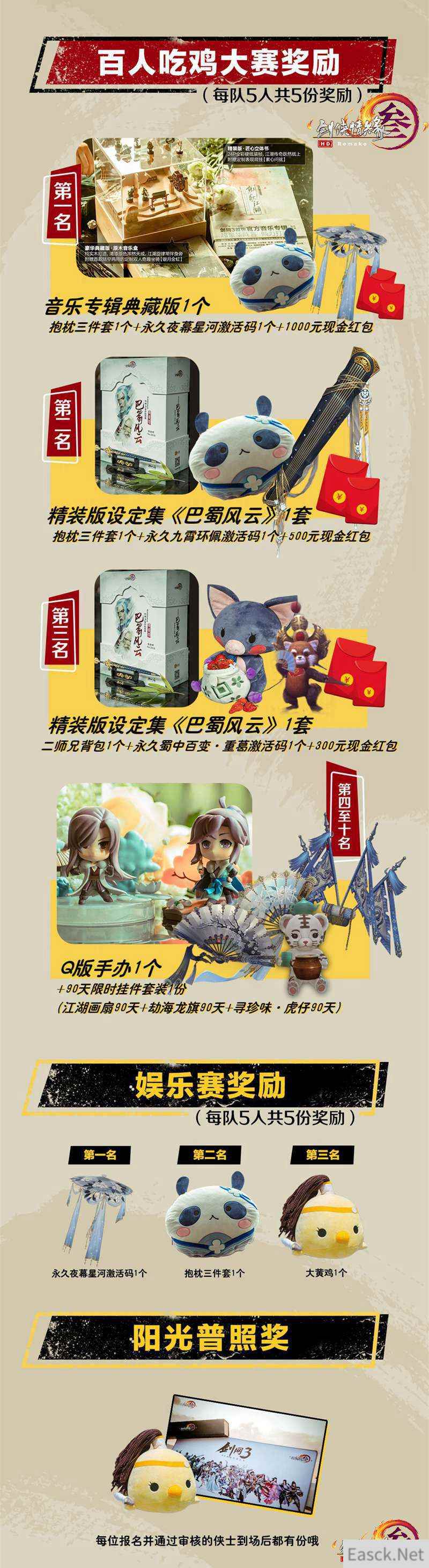 活动现场不仅美食小吃管饱,每位报名通过审核到场参与的侠士,还将有大黄鸡玩偶和《剑网3》定制鼠标垫先行奉上。在活动中取得名次的参赛队伍,更有机会获得巴蜀风云精装设定集、音乐专辑典藏版等精美实体周边;而永久夜幕星河、九霄环佩、蜀中百变?重葛等珍稀虚拟奖品也在等待各位侠士前来认领哦!所有奖品均可通过本次线下活动中的娱乐赛和吃鸡大赛中赢得!价值数十万的海量好礼等你来拿!