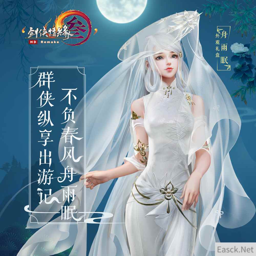 一、外观商城 1、春季礼盒 春季主题定制礼盒【舟雨眠】华丽上线!【舟雨眠】礼盒包含衣服、白发、帽子与罗伞四件套,除衣服本身具有轻柔曼妙的舞蹈动作,配套罗伞也精心打造了独特的伞舞特效动作。标志性的帽子采用轻纱斗笠造型,为侠士们提供更多的组合与搭配空间。 【舟雨眠】礼盒共有五款颜色搭配,4月9日20:05限量销售四款装备后绑定版的【舟雨眠】礼盒,分别为淡雅金、素雅青、优雅白和典雅粉四款配色,帽子、罗伞与衣服配色相符,每款颜色的【舟雨眠】礼盒各售卖5,000套(电信区4,000套,双线区1,000套),售价58,800通宝,20级及以上侠士方可购买。 同时,4月9日20:10还将限量销售一款经典黑白配色的装备后绑定版【舟雨眠】礼盒,该礼盒为墨色罗伞、帽子和优雅白色长衣的独特搭配,限量销售3,000套(电信区2,400套,双线区600套),售价58,800通宝,20级及以上侠士方可购买。 【舟雨眠】礼盒淡雅金、素雅青、优雅白和典雅粉四款配色还将于4月9日20:30限时销售购买后绑定版,售价58,800通宝,4月16日24:00下架,限时1周不限量销售。