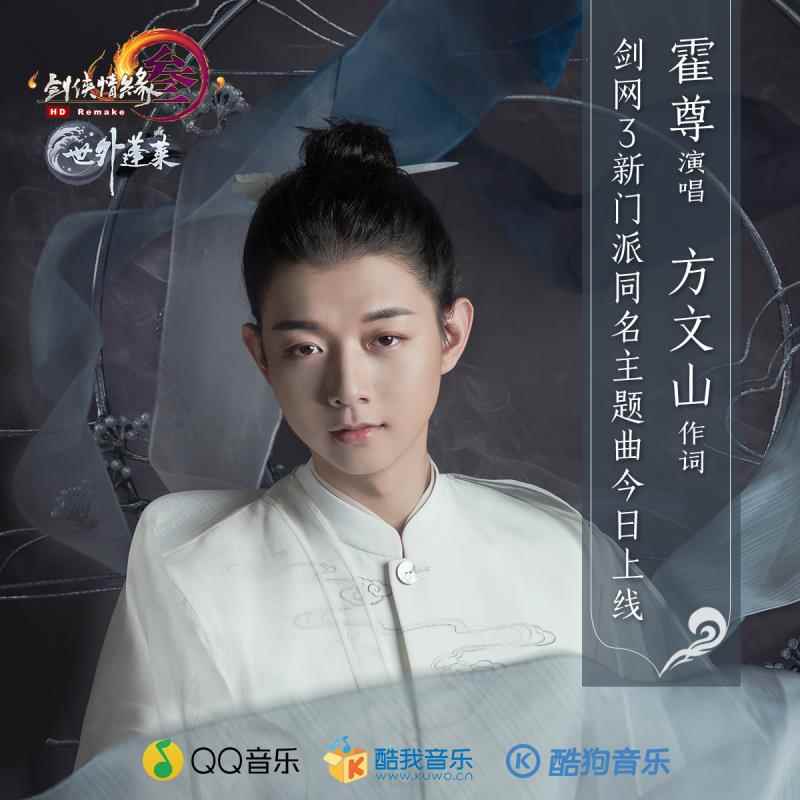 图3:“世外蓬莱”配音秀现场图 【霍尊演绎《剑网3》蓬莱主题曲】 当配音演出结束后,大气磅礴的音乐响起,由实力派歌手霍尊身着由盖娅传说为蓬莱定制的绝美礼服,于现场为侠士们演唱新版本同名曲《世外蓬莱》。 《世外蓬莱》由著名词作方文山与金牌音乐制作人罗宇轩联袂打造,词曲间描绘了世外桃源般的蓬莱美景,彰显了归隐世外的侠客在面对天下动荡,不愿独善其身的高风亮节。歌词“天破晓,梦不再逃,名与利几步之遥,我不要。”更是展现了东海蓬莱世家的铮铮傲骨!而在飘逸若仙的霍尊的实力歌唱下,更是赋予了这首歌曲非同一般的灵魂韵味,霍尊以其特有的天籁之声,纵情演绎了这首荡气回肠的蓬莱主题曲! “九万里风鹏正举,风休住,蓬舟吹取三山去。” 伴随着霍尊空灵优美的歌声,两位舞蹈演员入场,在曼妙的舞蹈中,两旁银幕缓缓开启,屏幕后的蓬莱仙山逐渐显露,由《剑网3》精心打造的蓬莱场景映入观众眼帘。在瀑布与干冰的场景烘托下,蓬莱门主方乾负剑立于群山之巅,威亚演员踏空而行,营造出了宛若仙境般的蓬莱盛景!而在这仙境中,著名Coser黄山饰演谢采、七雪饰演蓬莱大师兄、紫堂宿饰演蓬莱大师姐,身着蓬莱服饰从远处乘船登台,飘然梦幻,宛若仙人。在霍尊的实力演唱、灯光与场景的渲染烘托以及表演嘉宾的实力演出下,这场精彩的综合秀,仿佛一幅珍藏千年的写意画卷展现在了侠士们面前!