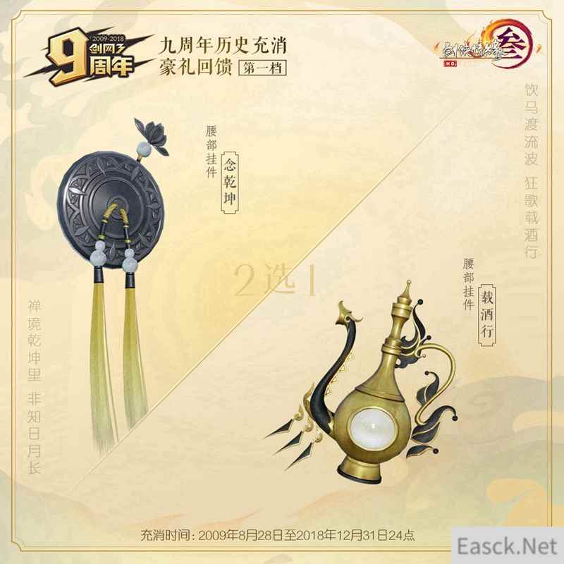 九载同路,剑指江湖。《剑网3》九周年线下庆典即将于8月26日-8月28日隆重召开!第一弹线上庆典现已火热开启,九周年5档回馈今日首曝,并将于8月24日正式上线!除了线上展开的全民庆典活动外,线下内容同样精彩。《剑网3》九周年线下嘉年华将于8月26日-8月28日在北京水立方多功能厅举办,外场行程今日放出!除了海量精彩节目与活动外,外场嘉年华还有部分余票可供侠士选购,更有全新《剑网3:指尖江湖》系列周边线下首发,诚邀侠士关注! 售票地址:https://piao.damai.cn/158224.html 【九载同路 周年5档回馈献好礼】 为了答谢广大侠士多年来的支持与厚爱,《剑网3》九周年系列活动现已陆续开启!老玩家登陆即可免费领取五档回馈,即自2009年8月28日《剑网3》公测起,至今年12月31日,九年内侠士在《剑网3》全区全服所有点卡、通宝消费均会累积计算,游戏币购买时长同样有效,侠士根据自身消费金额可免费获得相应档位奖励。 侠士所累计的消费金额为180元≤充值消耗<360元,可领取腰部挂件“念乾坤”、“载酒行”(2选1);
