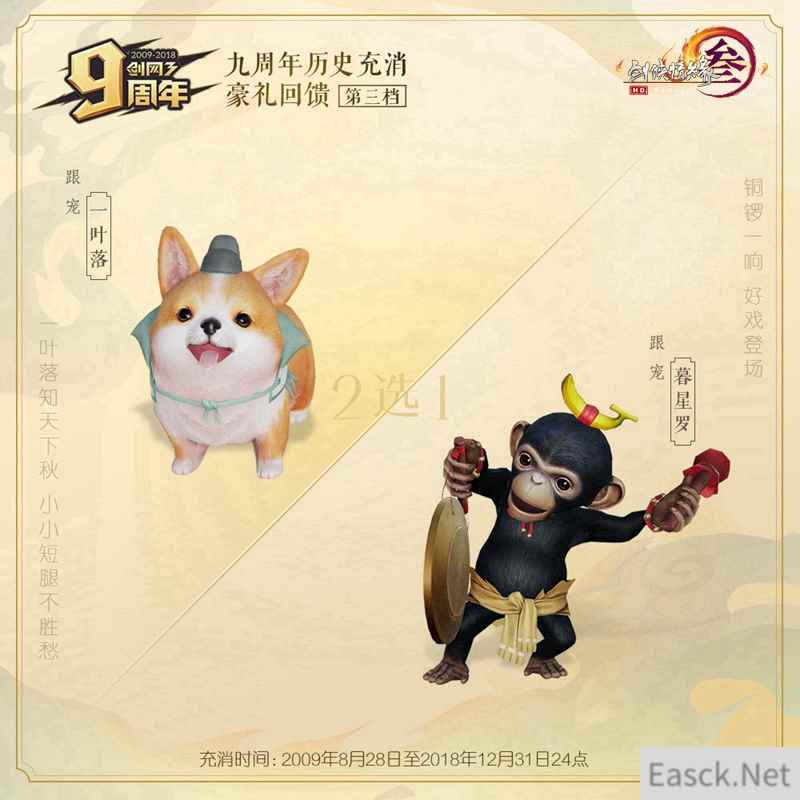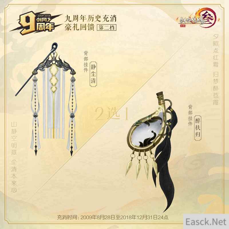 P2:背部挂件“静尘清”“醉扶归” 侠士所累计的消费金额为720元≤充值消耗<1440元,可领取周年纪念跟宠“一叶落”、“暮星罗”(2选1);