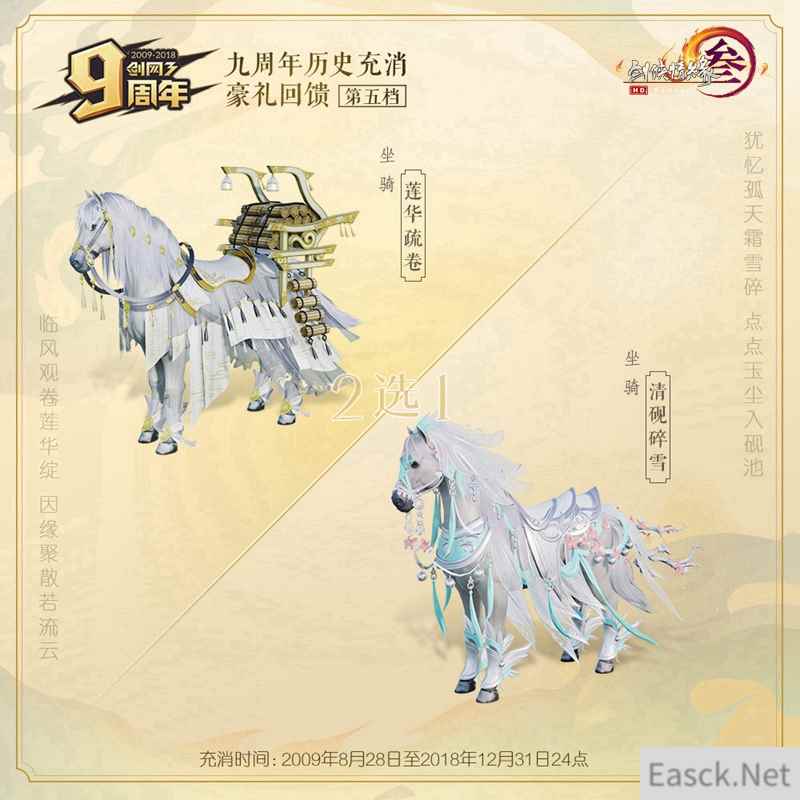 P4:周年特效称号“踏浪” 侠士所累计的消费金额≥2160元,可领取周年纪念坐骑“莲华疏卷”、“清砚碎雪”(2选1);