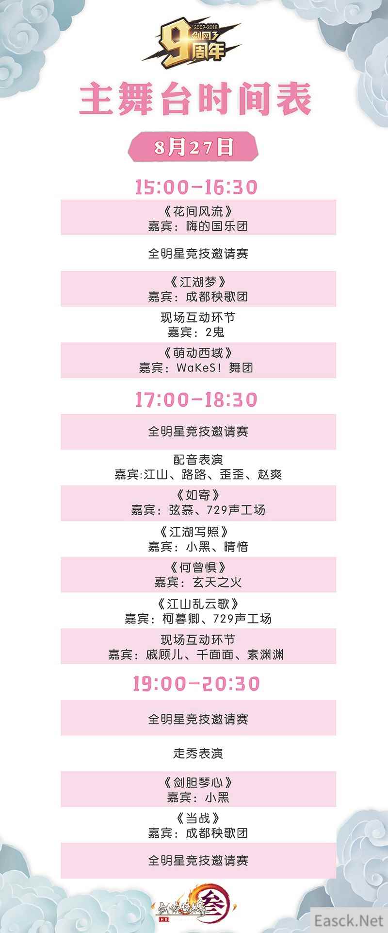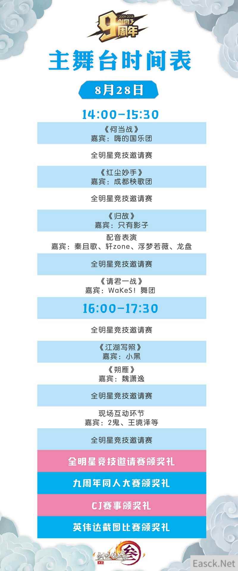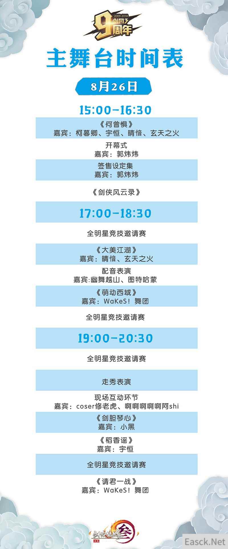 P5:周年纪念坐骑“莲华疏卷”“清砚碎雪” 【诸多精彩 嘉年华行程今日首曝】 除了《剑网3》为侠士们准备的海量线上福利外,《剑网3》线下嘉年华同样精彩,嘉年华节目行程今日推出! ·主舞台节目单 主舞台为侠士们准备了诸多节目!知名歌手、舞团、Coser线下齐聚,分时段表演精彩不断!知名CV现场演绎配音,侠士可进一步感受配音演员的独特魅力,更有全明星邀请赛与《剑网3》时装走秀重磅登场!同时,《剑网3》系列制作人郭炜炜还将于8月26日空降嘉年华现场,现场签售《剑网3》设定集,并将作为颁奖嘉宾于8月28日参与到嘉年华的颁奖典礼当中。超多精彩,即将呈现,敬请期待!