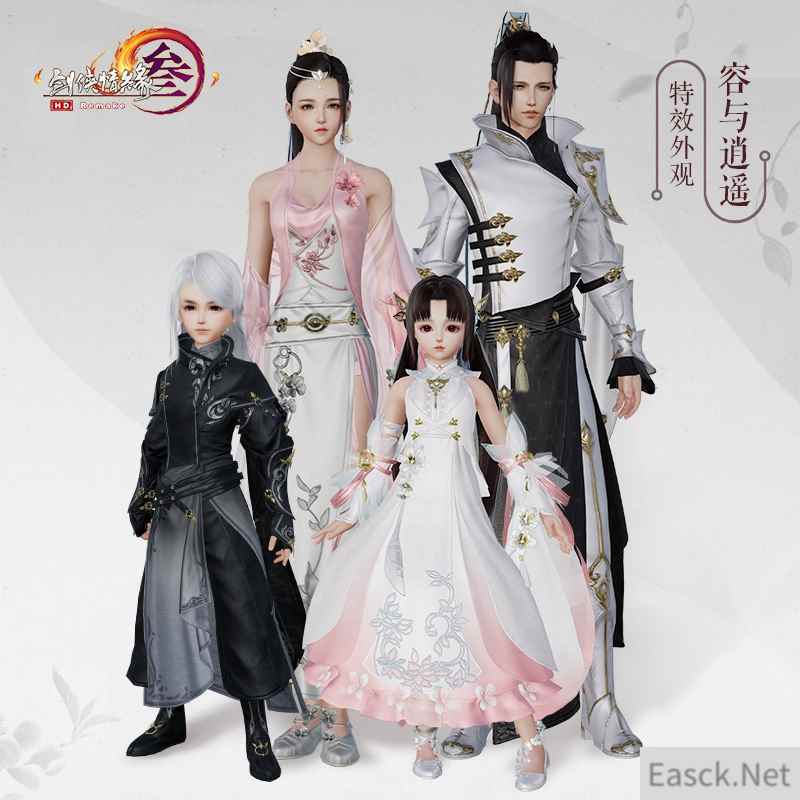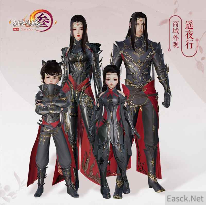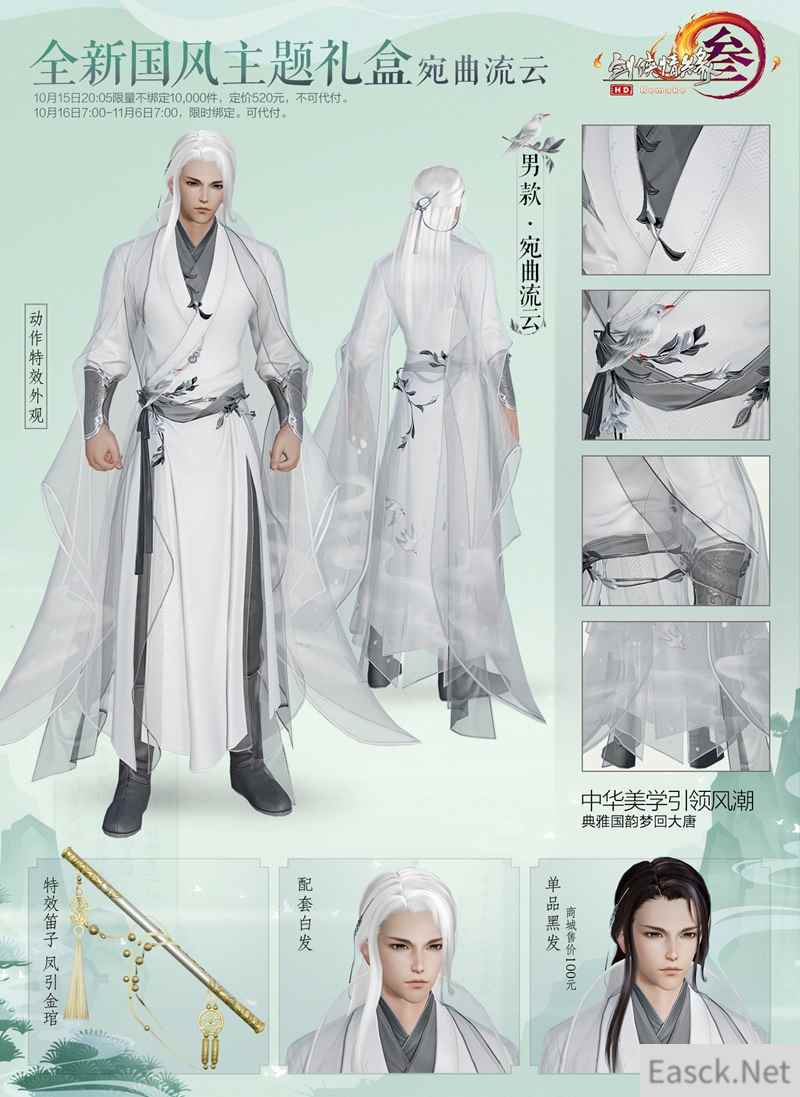 图6:特效外观“容与逍遥” 售卖时间: · “容与逍遥”特效外观(不绑定):10月15日20:15限量不绑定各5,000件(电信4,000个,双线1,000个),售价280元,不可代付。 · “容与逍遥”特效外观(绑定):10月16日7:00-11月6日7:00,限时绑定,售价280元,可代付。 【干练劲装 全新成衣上架商城 】 商城成衣“遥夜行”上架商城,修身劲装,干净利落,毫不拖沓,共6种偏色可供侠士选择,并于首周开展9折销售,配套白发黑发同步上架。