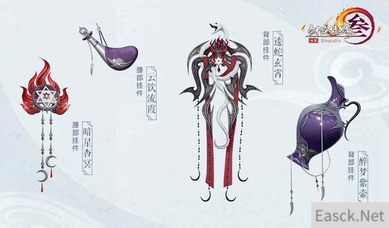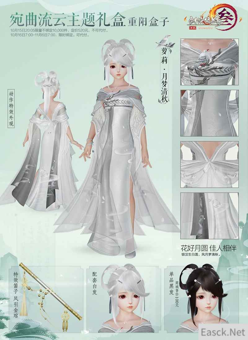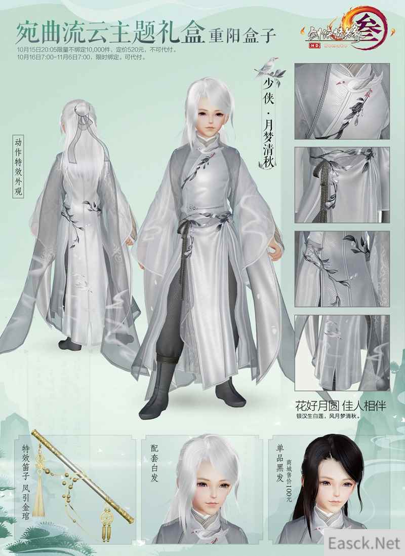 图7:商城成衣“遥夜行” 售卖时间: · “遥夜行”商城成衣:售价200元,首周9折销售。配套白发售价200元,黑发售价100元。 【10月充消曝光 趣味坐骑带你回顾趣味童年】 侠士们于10月参与充消活动,可根据充消金额获得腰部挂件“云饮流霞”、背部挂件“醉梦紫壶”,腰部挂件“暗星杳冥”、背部挂件“逶蛇玄霄”奖励。此外,第五档奉送奇趣坐骑“飞花镂月”,至德二年,重阳佳节。扬州南北商行出现了名为“飞花镂月”的车驾,此车结合被中香炉的工艺及木牛流马的机关术制成。车不但可以自行,且人在其上常常能平衡。江湖传言,此趣物出自鲁班后人公输灵之手,于是其价高涨,常求而不得。侠士可骑乘于其上,并做出专属动作,颇具趣味。 10月充消奖励如下: 60元/180元:腰部挂件“云饮流霞”或“暗星杳冥”二选一; 120元/240元:背部挂件“醉梦紫壶”或“逶蛇玄霄”二选一; 300元:“飞花镂月”特效背部挂件。