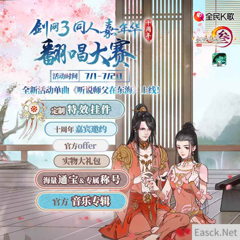 翻唱大赛细节海报 【东海主题舞曲首曝 渔家少女千里报恩情】 从2010年首届“江湖名人堂”开始,《剑网3》同人盛典已经迎来第十届。每年如约而至,规模愈发壮大,一直以来,《剑网3》都在不断打造衍生文化产品,从同人、周边、音乐、舞台剧、动漫再到影视等领域,致力于构建一个《剑网3》泛娱乐超级IP! 在听取了侠士们对于历来同人大赛的建议,帮助有志于商业化的剑网3同人作品步入市场,以及合理、规范使用剑网3官方作品,形成和谐、有爱、活跃的音乐创作、传播氛围,以此建立更加健康的版权环境《剑网3》官方还将梳理一份维权规范,为所有参与同人创作的侠士保驾护航! 值此翻唱大赛以及新资料片“怒海争锋”的上线之际,《剑网3》特地为侠士们带来了一首东海主题舞曲《听说师父在东海》,这首歌曲讲述了一个古灵精怪的渔家小姑娘千里报恩的故事,并将作为本届同人嘉年华翻唱大赛的活动单曲,并将于今日上线TME平台。为了满足侠士们线上K歌与线下表演、原创舞蹈等多样化的需求,本次翻唱大赛也将首次开放原创舞曲的翻唱,并将在后续为侠士们带来精彩的舞曲版MV,敬请期待!歌曲同名MV将于今日抢先上线,赶紧和资讯君一起来看看吧!