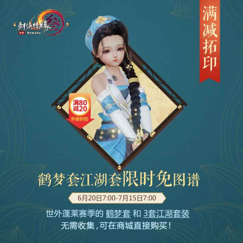 群雄夺擂,逆转狂澜!《剑网3》全新资料片“怒海争锋”已于6月20日正式公测!全新地图鲲鹏岛满载9段剧情动画;诸多全新NPC登上江湖舞台;公平对战MOBA新玩法开启共创计划;三大创新副本同步登场;战场升级按分匹配;名剑大会新增开房间对战模式;海岛吃鸡新地图;“炸弹人”休闲玩法,以及武林通鉴安史之乱回归升级路线等等诸多内容现已上线,诚邀侠士上线体验! 当侠士闯荡东海时,没有一身符合身份的行头怎么行?在6月20日7:00-7月15日7:00期间世外蓬莱赛季的鹤梦套校服和3套江湖套装开放拓印,侠士无需收集图谱即可在商城直接进行拓印!与此同时,每个角色还可在活动期间在运营活动界面免费领取一张满80-20的外装折扣券(该折扣券仅用于购买成衣及拓印分类的商品,无法与其他折扣券一起使用)!