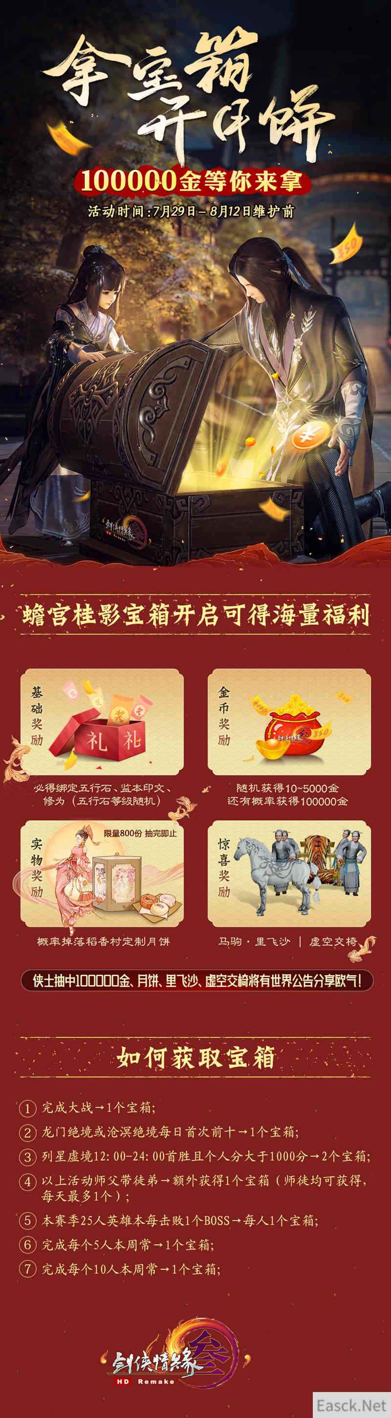 随着《剑网3》十周年的临近,许多侠士早已按捺不住急迫的心情想要打听十周年的举办地,别着急,资讯君今日就告诉大家一个好消息——关于十周年发布会的举办城市将于明日正式宣布,诚邀侠士关注!与此同时,《剑网3》十周年纪念活动第一弹即将在29日正式开启,全民狂欢,福利多多,今日再爆全新内容,赶紧和资讯君一起来看看十周年庆典的最新情报吧! 【拿宝箱开月饼 还有十万金等你来拿】 《剑网3》十周年活动第一弹——“拿宝箱,开月饼”活动即将于7月29日正式开启,侠士参加活动拿宝箱开海量福利——最高100,000金的丰厚奖励,里飞沙、虚空交椅等惊喜掉落,更有机会获得剑网3大IP X 稻香村联合推出的2019“梦回稻香”定制月饼礼盒! 在7月29日—8月12日维护前,侠士完成大战日常、10人秘境周常、5人秘境周常,当日首次进入绝境活动前十即可获得一个“蟾宫桂影”的活动宝箱奖励!此外,师徒在共同完成大战或绝境活动进入前十均可额外获得一个“蟾宫桂影”宝箱;参与列星虚境获得首胜且个人分大于1000分时,可获得2个“蟾宫桂影”宝箱;参与本赛季25人英雄秘境每击败一位首领也将掉落一个“蟾宫桂影”宝箱! “蟾宫桂影”宝箱奖励丰厚,开启后将必定获得得绑定五行石、监本印文、修为等基础奖励(五行石等级随机);以及随机10~5,000金的奖励,还有概率获得100,000金的丰厚奖励;更有随机掉落2019“梦回稻香”定制月饼礼盒赠送(限量800份,抽完即止);同时,还有马驹·里飞沙、虚空交椅等惊喜掉落!侠士抽中100,000金、月饼、里飞沙、虚空交椅将有世界公告分享欧气!全民狂欢,福利多多!