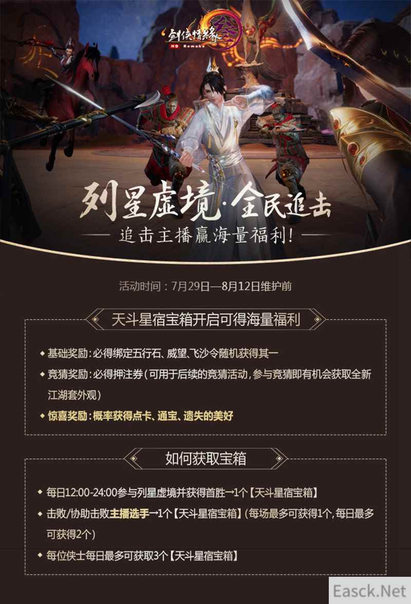【列星虚境全民追击 击败主播赢海量福利】 除了全民狂欢的“拿宝箱·开月饼”活动外,还有重磅福利活动——“列星虚境·全民追击”同步开启!在7月29日—8月12日维护前,侠士每日12;00-24;00 参与列星虚境活动,并获得首胜即可获得一个“天斗星宿”宝箱,倘若有幸主播队伍,击败/协助击败主播选手还将额外一个“天斗星宿”宝箱!值得一提的是,击败主播宝箱每场最多可获得一个宝箱,每日最多可获得两个宝箱。即每位侠士每日最多可获得三个“天斗星宿”宝箱。 开启“天斗星宿”宝箱可得海量福利,将随机获得绑定五行石、威望、飞沙令中任一基础奖励,同时还有点卡、通宝、遗失的美好等惊喜概率掉落!除此之外,侠士还将会获得一张“押注券”,该“押注券”可用于后续的竞猜活动中,参与竞猜即有机会获得全新江湖套装哦!至于是竞猜的形式如何?资讯君先在这里卖个小关子,更多详情请留意后续的消息。 还在等什么,资讯君在此向各位侠士发出诚挚邀请,是时候向主播选手展示你们真正的实力了!列星虚境,全民追击,一决高下,等你来战!