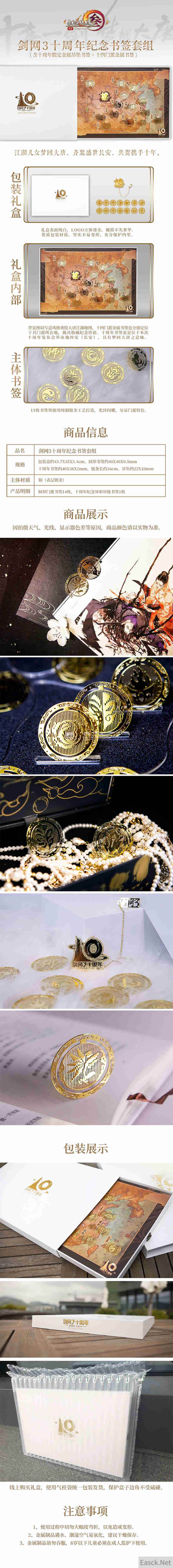 周年五档充消福利 与此同时,延续周年经典福利,往年的周年回馈也会如约上架商城限时售卖,在8月22日7:00~8月29日7:00期间,侠士可以使用通宝或商城积分跨越时光的洪流,购买错过的三周年至九周年的周年回馈,心动的侠士一定不要错过! 【江湖儿女齐聚盛世长安 十周年纪念书签即将发售】 江湖儿女梦回大唐,齐聚盛世长安,共贺携手十年。《剑网3》十周年纪念书签套组含十周年吊坠书签+十四门派书签。书签皆采用纯铜材质表层镀金,光泽闪耀。包装礼盒以写意风格重绘大唐江湖地图,十四门派金属书签分别定位于其门派所在地,周年庆书签更位于本次周年庆举办地——长安(西安),该礼盒极具收藏纪念价值。除了购买《剑网3》十周年内场发布会门票的侠士均可现场免费获得一套外(因该礼品需购票者本人持纸质门票到指定位置兑换,如购票者本人未能到现场,则视为自动放弃),还将于8月26日上架游戏、西山居周边商城,进行发售!与此同时,在8月28日-9月1日期间,还将于《剑网3》十周年庆典外场500份限量现货发售,数量有限,先到先得! 商城售卖地址:https://mall.xoyo.com/detail?id=27