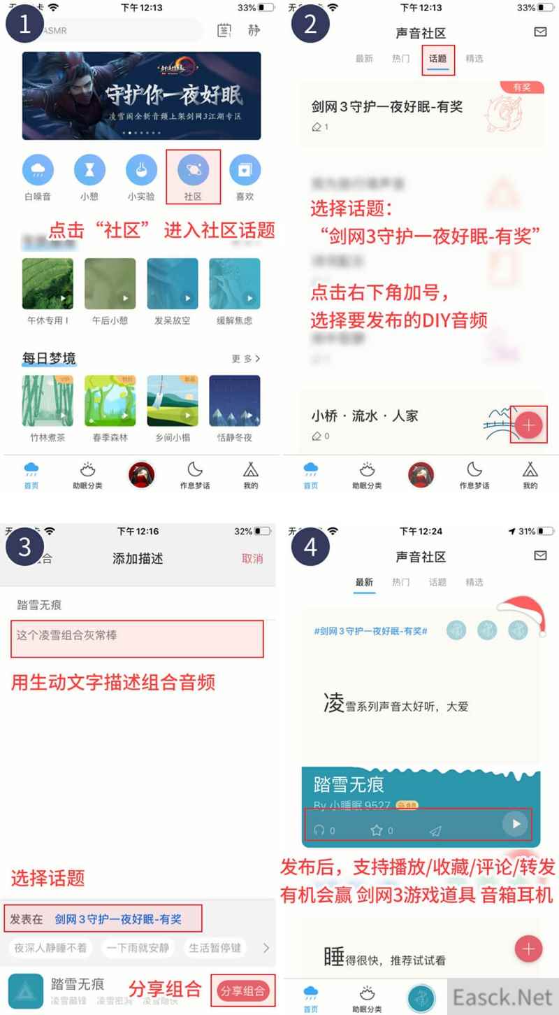 每一个热爱生活的人,都值得拥有好睡眠!小睡眠APP 作为5,000万人都在用的健康睡眠新概念应用, 为用户提供白噪音、冥想曲、助眠ASMR、爱豆哄睡、晚安电台、入睡提醒、睡眠监测、梦话录音、闹钟和午休小憩等诸多功能!以专业、全面和暖心的睡眠服务,令侠士们睡得更好睡得更香,并希望籍此唤起侠士们对睡眠重要性和睡眠质量的关注! 在睡眠管理基础上,小睡眠超棒氛围音也将是侠士们提高工作、学习、生活效率好帮手,更是用户冥想静心、灵感碰撞、阅读学习的小伴侣! 而作为小睡眠APP 的一大亮点,侠士们除了能够聆听到诸多江湖的声音外,还可自由体验小睡眠其独特的音频DIY玩法!通过将不同门派的音频进行随意组合,打造出属于侠士自己的江湖之声!此外,侠士还可前往参与小睡眠社区中参与话题互动,即有机会获得助眠大礼包!值得一提的是,小睡眠APP 现已上线微信小程序,侠士也可前往微信小程序收获这份来自《剑网3》的江湖之声哦!