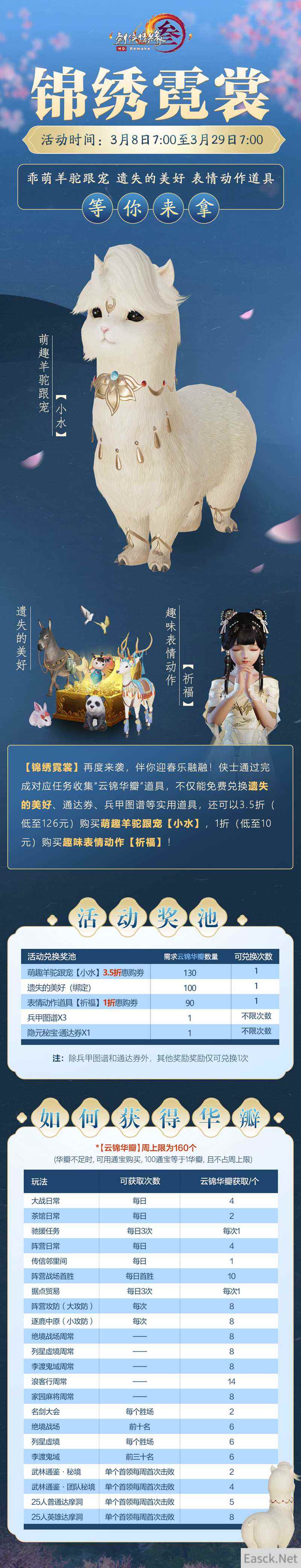 【春光明媚喜气洋洋 锦绣霓裳再度回归】 迎接春天到来,新一期“锦绣霓裳”今日同步登场送来缤纷奖励!3月8日7:00至3月29日7:00期间,侠士通过完成对应任务收集【云锦华瓣】道具,不仅能免费兑换【遗失的美好】、【通达券】、【兵甲图谱】等实用道具,还可以3.5折(低至126元)购买萌趣羊驼跟宠【小水】,1折(低至10元)购买趣味表情动作【祈福】!