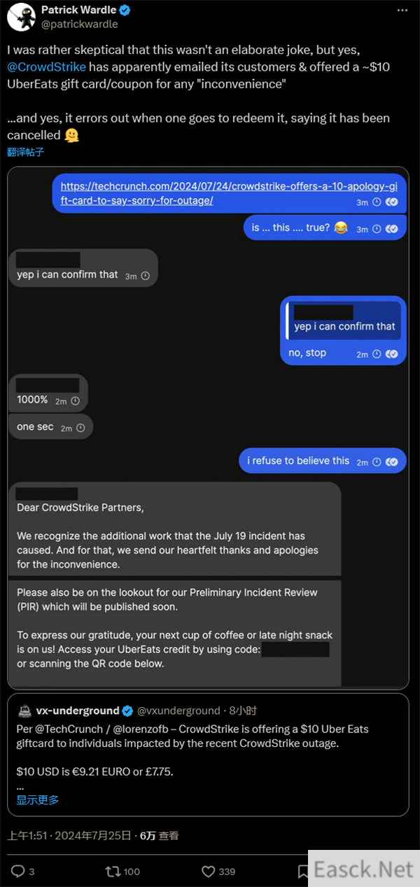 7 月 19 日,一场被称为“死亡蓝屏”的危机影响了全球数百万台 Windows 计算机,导致它们在几个小时内无法运行。微软后来透露,此次事件是由独立网络安全公司 CrowdStrike 的软件更新引起的。最近的事态发展表明,这家公司将向受影响的用户提供一张 10 美元的外卖礼品卡作为造成大量公司上亿美元损失的赔偿。 ![]() 据 TechCrunch 报道,CrowdStrike 首席商务官 Daniel Bernard 在 7 月 18 日至 19 日期间向受影响的用户发送了电子邮件,承认发生了蓝屏事件。该邮件的屏幕截图现已在推特上被许多用户分享。 电子邮件称,为了表达“衷心感谢并对给您带来的不便表示歉意”,CrowdStrike 希望使用 10 美元的 Uber Eats(海外的饿了么/美团外卖,由优步 Uber 公司提供服务)优食礼品卡为受影响的用户支付“下一杯咖啡或夜宵”。另一位用户则透露,英国受影响的用户仅收到了价值为 7.75 英镑的礼品卡。 ![]() 一些用户可以成功兑换 CrowdStrike 的礼品卡,而另一些用户则没有那么幸运。那些无法购买的人会在 Uber Eats 优食上看到一条错误消息,指出礼品卡“已被发行方取消,不再有效”。 目前看来这应该不是 CrowdStrike 唯一的补偿措施,仅仅是面向终端用户的一个小礼物,否则就真的有点“幽默”了。暂不清楚微软或是一些受影响的公司(例如受蓝屏影响导致大量航班停运的航空公司)是否会就造成经济损失起诉 CrowdStrike。 ![]() 无论如何,这家科技公司目前向用户承诺,其云服务已经进行了改进,并发布了一份初步事件报告,详细介绍了该事件以及为防止其再次发生而采取的措施。 |
