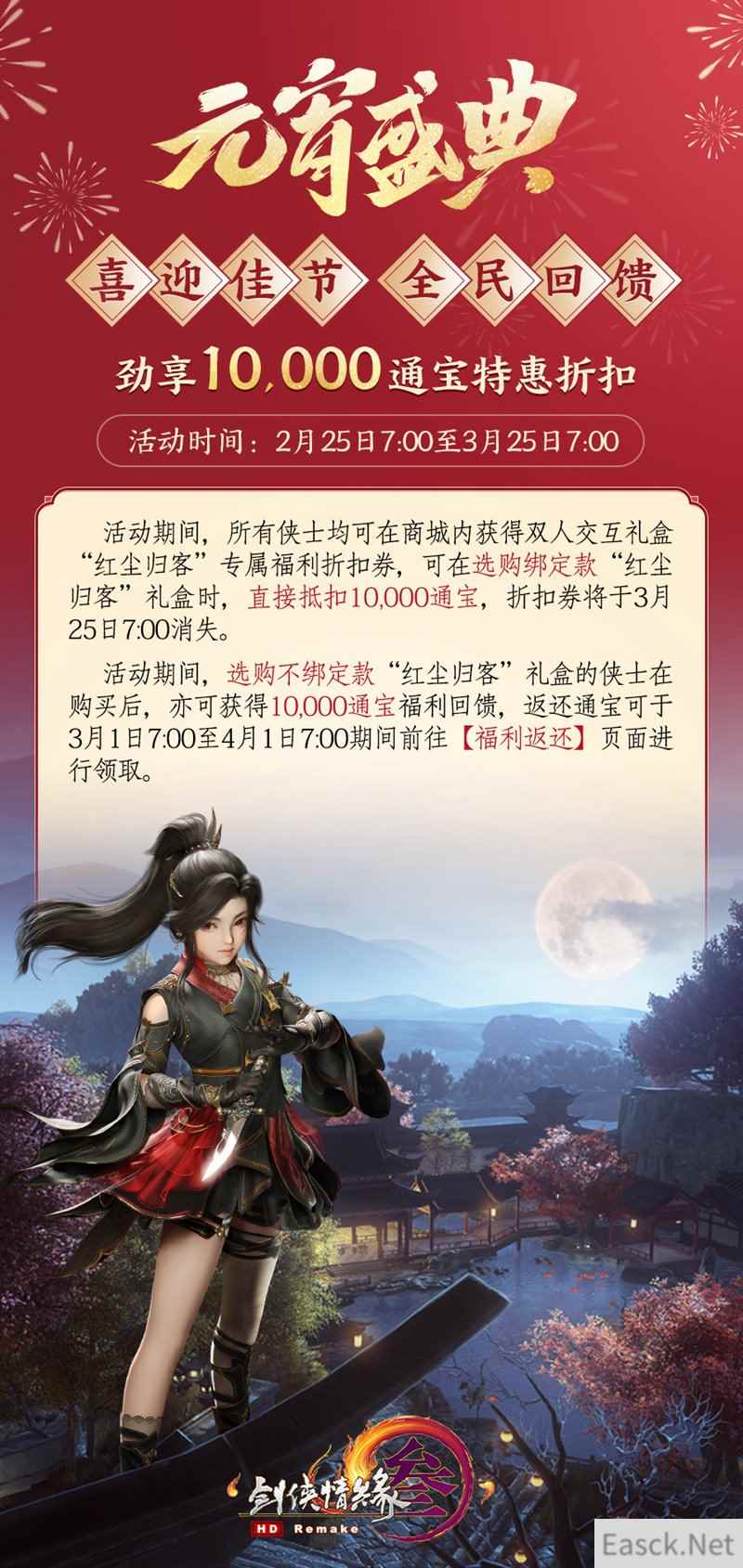 【喜迎上元节 全民劲享特惠折扣】 上元喜乐同欢庆,全民劲享特惠折扣!2月25日7:00至3月25日7:00期间,所有侠士均可在商城内获得全新兵器动捕主题双人交互礼盒“红尘归客”专属福利折扣券,可在选购绑定款“红尘归客”礼盒时,直接抵扣10,000通宝,折扣券将于3月25日7:00消失。而选购不绑定款“红尘归客”礼盒的侠士在购买后,亦可获得10,000通宝福利回馈,返还通宝可于3月1日7:00至4月1日7:00期间前往【福利返还】页面进行领取,还请侠士们千万不要错过!