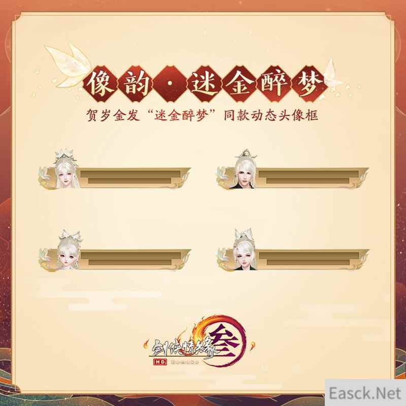 同款动态头像框·像韵·迷金醉梦 上架详情:2月25日7:00至3月25日7:00上架,限时4周。售价15,000通宝,为不绑定款。可代付,不可用折扣券。