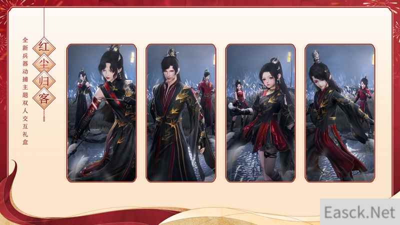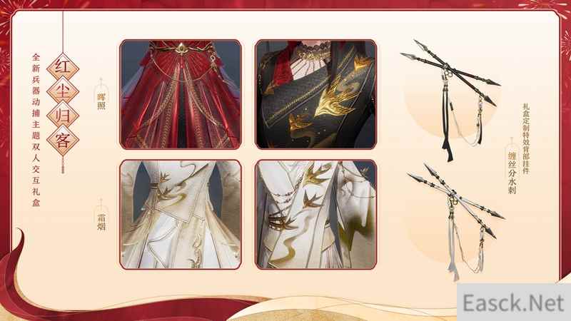 【全新兵器动捕主题双人交互礼盒·红尘归客】 还原江湖气,尽显侠者意,全新武器动捕主题双人交互外装礼盒“红尘归客”酷炫来袭!融入中国武林三大名宗之一的峨眉派武学,礼盒内定制特效背部挂件“缠丝分水刺”将其代表武器“峨眉刺”高度还原,更邀请到师承峨眉派、极具人气的酷飒女侠@凌云凌公子 参与到“缠丝分水刺”特效表现的动作捕捉制作中,凭借其扎实的武术功底,为你呈现最为真实最为潇洒的江湖写意!而在今后,也将有更多富有武侠元素的武术动作表现,还请侠士们多多期待! 值得一提的是,全新外装礼盒“红尘归客”共推出“晖照”、“霜烟”两款不同偏色,服饰外衬可自由穿戴,随心选择!飘逸不羁,干练十足,飒洒英姿尽显江湖侠者风范!更有全体型双人交互特效表现趣味十足,根据体型的不同共有16种不同组合搭配,主动邀请与接受邀请时进行的表现也各有不同。而在双人交互中,每种组合均有2套不同的待机交互与1套行走交互,各具特色,共计48个独特的交互表现动作让侠士们的体验更加丰富! 全新兵器动捕主题双人交互礼盒“红尘归客”今日上架商城,详情如下: 共有2款偏色可供选择 礼盒包含(布料2.0可穿戴双人交互成衣+绑定款定制黑发+定制白发+定制特效背部挂件“缠丝分水刺”) 不绑定款:2月25日20:05限量30,000(电信24,000双线6,000)个,原价68,800通宝,购买后可获得10,000通宝福利回馈,并可选择获得2款不同偏色主题其中1款不绑定外装礼盒。不可代付,不可用折扣券。通宝回馈在3月1日7:00至4月1日7:00期间前往【福利返还】页面领取。 绑定款:2月25日20:35至3月25日7:00上架,限时4周,原价68,800通宝,可直接选择心仪偏色进行购买。可使用专属福利折扣券,抵扣10,000通宝,折后价58,800通宝。可代付,代付时不可使用专属福利折扣券。 推栏不绑定款:2月25日20:35限量300(电信240双线60)个,原价68,800通宝。购买后可获得10,000通宝福利回馈,可在3月1日7:00至4月1日7:00期间前往游戏内【福利返还】页面领取。