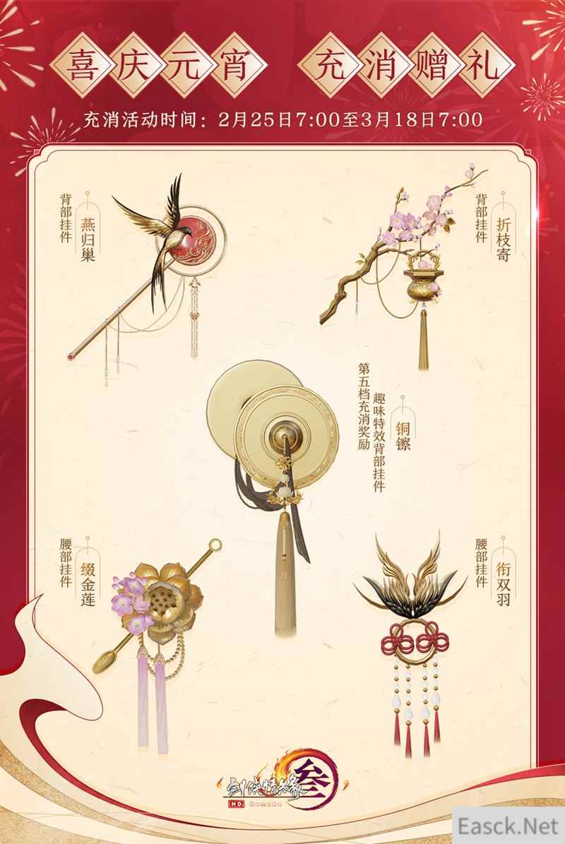 【双倍积分添喜气 充消好礼闹元宵】 庆佳节怎能少得了积分回馈呢?2月25日7:00至3月1日7:00期间,侠士参与充消即可尊享2倍积分回馈。不仅如此,新一批的充消回馈奖励也在今日登场!2月25日7:00至3月18日7:00期间,侠士参与充消活动,可根据充消金额获得精美腰部挂件“缀金莲”、背部挂件“折枝寄”、腰部挂件“衔双羽”、背部挂件“燕归巢”,以及第五档充消奖励·趣味特效背部挂件“铜镲”! 全新充消活动奖励活动详情如下: 充消时间:2月25日7:00至3月18日7:00 60/180元:可获得腰部挂件“缀金莲”与“衔双羽”二选一。 120/240元:可获得背部挂件“折枝寄”与“燕归巢”二选一。 300元:可获得趣味特效背部挂件“铜镲”。