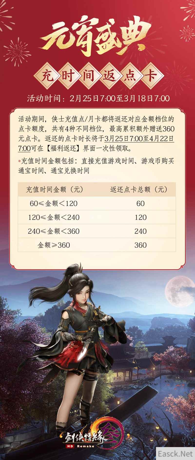【经典福利活动回归 充时间返点卡倾情回馈】 在这元宵佳节喜乐时刻,备受侠士喜爱的经典福利活动“充时间返点卡”再度回归!2月25日7:00至3月18日7:00期间,侠士充值点/月卡(包括直接充值游戏时间、游戏币购买通宝时间、通宝兑换时间)都将根据档位返还对应的点卡额度,共有4种不同档位,最高累积额外赠送360元点卡。返还的点卡时长将于3月25日7:00至4月22日7:00可在【福利返还】界面一次性领取,一步到位无需担忧!