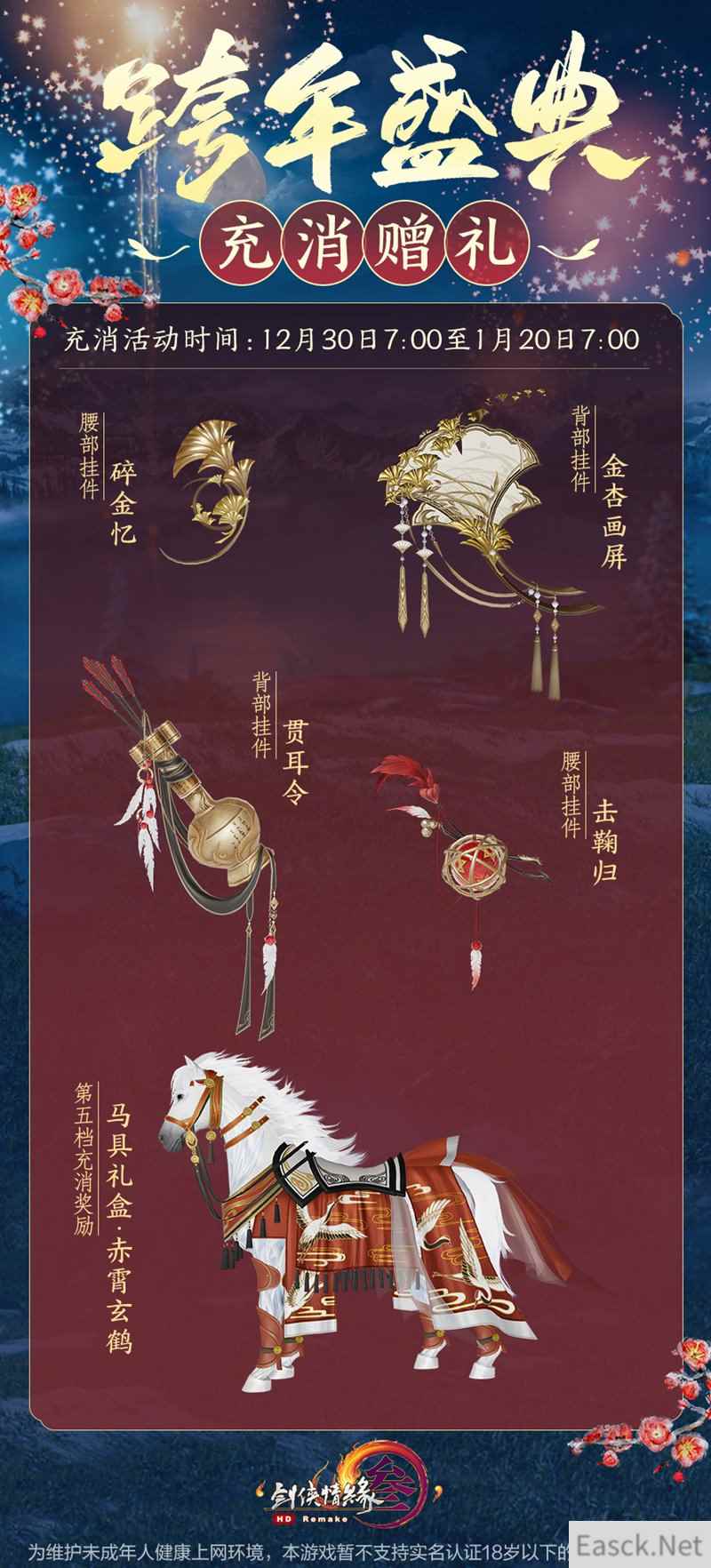 【新年充消新回馈 喜气洋洋新马具】 与此同时,新一期的充消回馈也同步来袭!12月30日7:00至1月20日7:00期间,侠士参与充消活动,,可根据金额获得精美腰部挂件“碎金忆”、背部挂件“金杏画屏 ”、腰部挂件“击鞠归”、背部挂件“贯耳令”,还有第五档充消赠礼——马具礼盒“赤霄玄鹤”! 全新充消活动奖励活动详情如下: 充消时间:12月30日7:00至1月20日7:00 60/180元:可获得腰部挂件“碎金忆”与“击鞠归”二选一。 120/240元:可获得背部挂件“金杏画屏 ”与“贯耳令”二选一。 300元:可获得马具礼盒“赤霄玄鹤”。