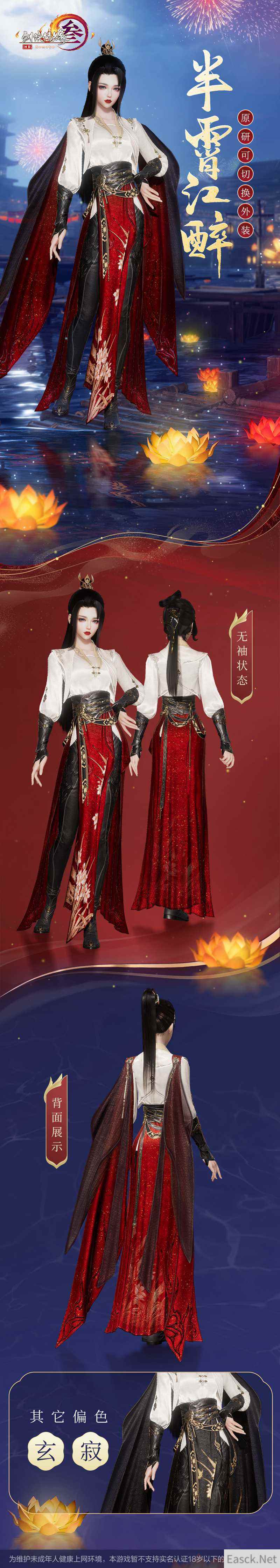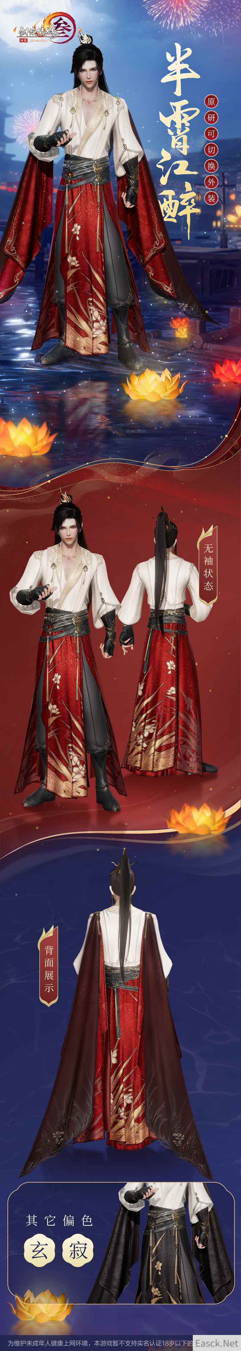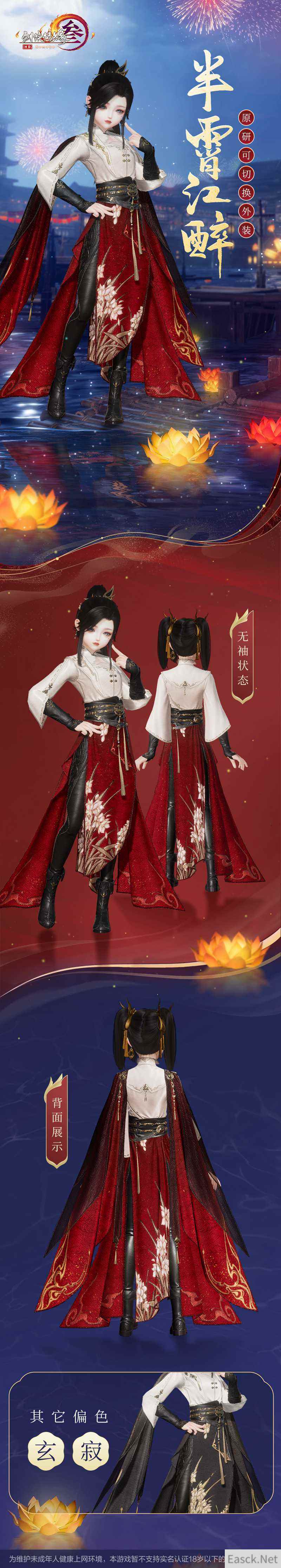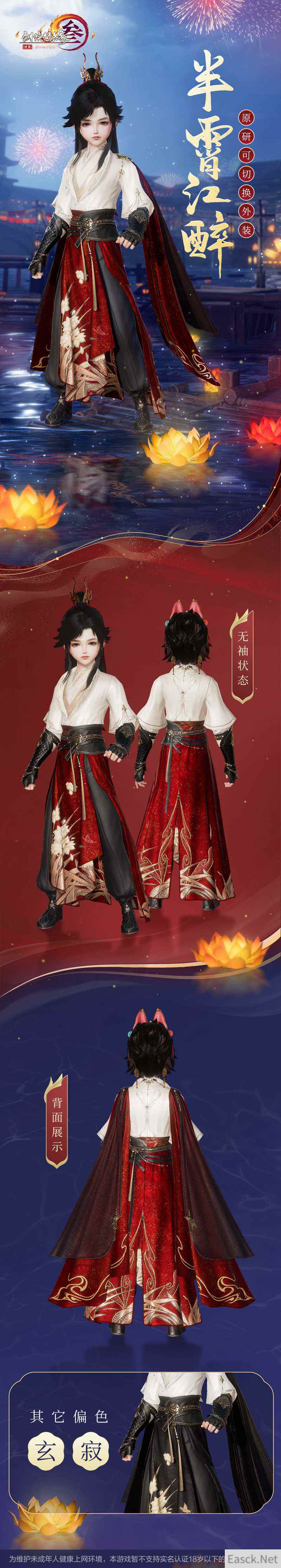 【横江醉卧 笑问来者 原研系列可切换外装“半霄江醉”登场】 少年尽显疏狂意,明朝试问仍少年,原研系列再添新品,全新可切换外装“半霄江醉”酷飒来袭!款型干练却不失贵气,并有綪茷色的“夜歌”和京元色的“玄寂”两款偏色可供选购! 成男款修身干练,去除繁荣,更显潇洒意气。米色与玄色相映成趣,张扬恣意尽书豪情!成女款简约酷飒,裙摆绣纹繁花盛开,似春风已至,彰显朝气活力!萝莉款颇具侠气,玄色束腕与镶金束腰给人以威严之感,却又从明暗双色的强烈对比中突出少年人的不羁与狂放!正太款则更加沉稳,褪去孩童稚气,倒透出江湖侠客风流飘逸之韵味。腰间金饰与流苏掩映,搭配纯色衣摆,自是正气十足! 值得一提的是,本次原研系列外装“半霄江醉”还可自由切换袖摆!侠士可选择以飘逸的袖摆凸显侠者来去无踪的自在;亦可收起袖摆尽书干练意气! 原研系列可切换外装“半霄江醉”将于12月30日上架商城,详情如下: 采用布料2.0技术,主打多元化风格。共有两款偏色可供选购,袖摆可随心切换。 不绑定款:12月30日20:15限量10,000(电信8,000双线2,000)个,售价28,000通宝,不可用折扣券。 绑定款:12月30日20:30至1月20日7:00上架,售价28,000通宝,不可用折扣券。 推栏不绑定款:12月30日20:40限量100(电信80双线20)个,售价28,000通宝,不可用折扣券。