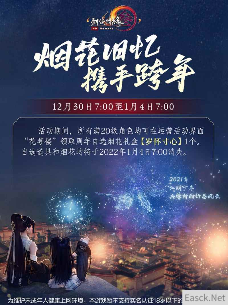 【相约跨年 用烟花点亮心中旧忆】 迎新年自然要喜气洋洋,让绚烂的烟花来抒发此刻心情吧!12月30日7:00至1月4日7:00期间,我们为所有满20级的角色均奉上一份周年自选烟花礼盒【岁怀寸心】!侠士可在运营活动界面“花萼楼”中领取,开启后可任选一款获得。让美好回忆化作绚烂烟火点亮夜空,你我相约这江湖相伴共跨年!