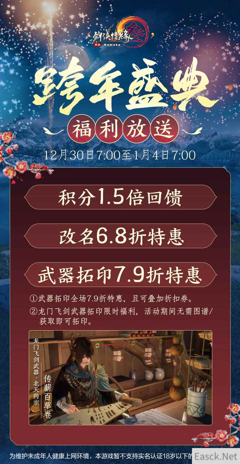 看完视频想必侠士们已然对其有了更多了解,主题曲《归梦长》现已上架酷狗、QQ音乐、酷我音乐三大平台,欢迎侠士前往欣赏! 同时,随着《归梦长》首映,《剑网3》“跨年盛典”大幕也随之拉开!诸多暖心福利同步开启,与侠士们共迎跨年时刻,祝祷新年安康顺遂!那么话不多说,就让我们一起来看看吧! 【迎新年福利不停 携手迈入新征程】 迎新年福利大放送!12月30日7:00至1月4日7:00期间,全场劲享1.5倍积分回馈!还有改名服务惊喜6.8折特惠,为侠士们带来更多便利!不仅如此,大家期待已久的龙门飞剑武器拓印福利再度回归,无需图谱或获取,也可随心拓印,且全场武器拓印皆享7.9折特惠,并可叠加折扣券哦!