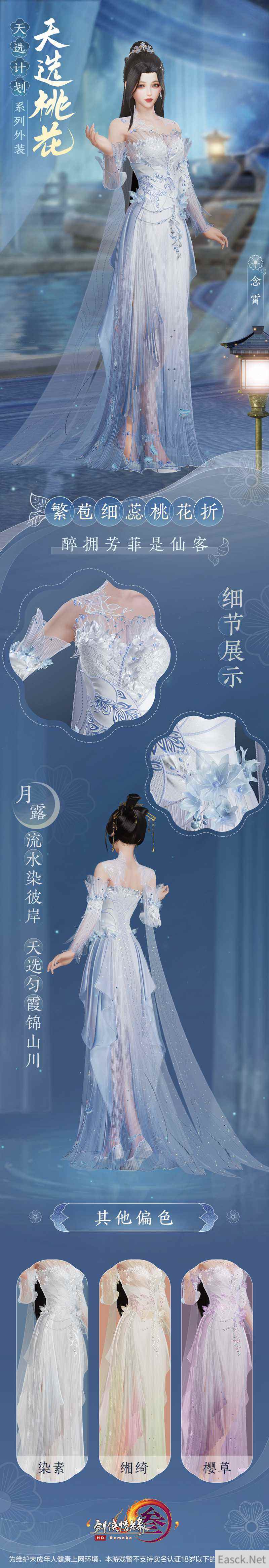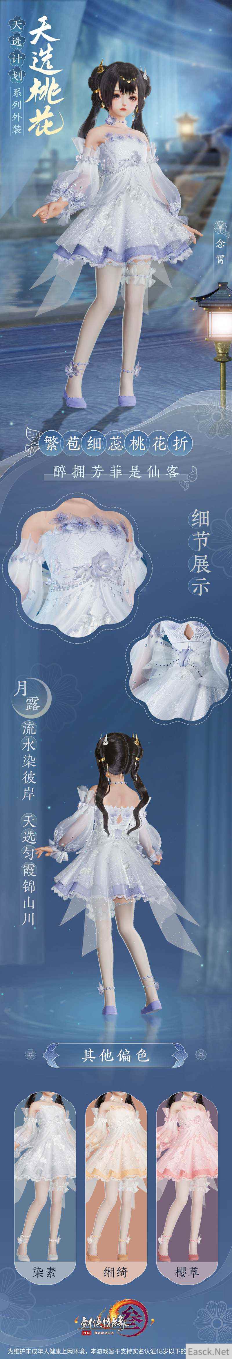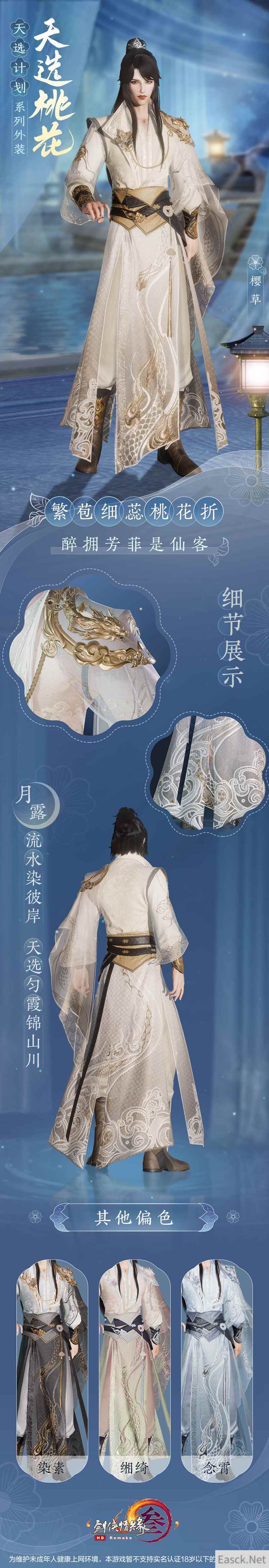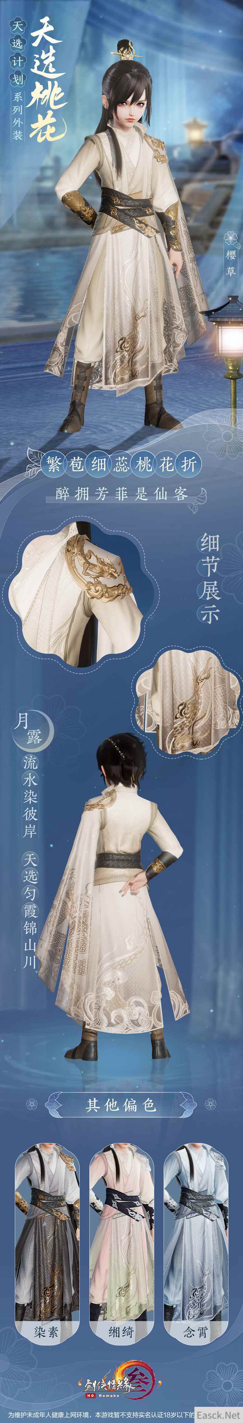 侠士们期待已久的天选系列之“天选桃花”今日终于迎来首曝!不仅如此,还有全新“妙喵”主题头像框及表情包也将于今日萌动亮相,伴随侠士萌游江湖! 【经典复刻再度来袭 “天选桃花”外装今日首曝】 流水溪畔,桃花映红。作为天选系列的第二弹,“天选桃花”外装设计延续了首期精良的制作工艺的同时充分参考了侠士们的建议,除保留原有设计的经典桃花元素外,另使用全新材质、重新建模,力争带给侠士耳目一新的时尚新体验!“天选桃花”外装款式华美仙雅,共推出四款偏色以供玩家选择,快来一睹“天选桃花”之绝美风姿! 成女款一袭长裙仙韵飘渺,整体保留了经典桃花元素,晶透的桃花链饰更衬纤细腰姿。肩际高级透纱点缀,玲珑花瓣暗纹绣其上,宛如身着荧光流月。芊芊玉臂以薄纱紧束,两缕轻帛自臂弯垂落,怎能不叹一句天仙落凡!裙摆素锻交落,搭配半透薄纱相掩映,裙袂飘飘,优雅自持。 成男款长衫翩翩。肩部携飞龙盘绕,又以海浪暗纹相衬,其后一抹轻披随风垂落,以寄凌云之志。腰间素缎相裹,又以玲珑玉佩作饰,衣摆龙纹云游其上,保留真实自然褶皱,更衬侠士潇洒俊逸! 萝莉款采用短裙设计,胸前与腰间以花饰点缀,蓬松袖摆又添一分活泼灵动。裙摆层叠,蕾丝与裙褶暗纹的设计更显少女体态翩跹,宽幅蝴蝶玉带缀于身后,宛如人间精灵再现。 正太款修身长衫为底,银白窄袖护腕更显少年仙姿卓然。衣摆游龙摆尾,整体设计简约大气,全新材质与奢华质感,将劲装的潇洒与帅气悉数展现! 同时,“天选桃花”外装亦有专属特效。开启服饰特效后,桃花落英随风而舞,拈一朵桃花流转于指尖。春风一树,不如你一眼回眸。 天选计划系列外装·天选桃花将于4月29日上架商城,详情如下: 共有四款偏色可供选购。 偏色·染素 上架详情:4月29日20:00至5月5日7:00限时上架,售价28,000通宝,为不绑定款,不可使用折扣券。 偏色·念霄 不绑定款:4月29日20:05限量5,000个,售价28,000通宝,不可使用折扣券。 绑定款:4月29日20:20至5月5日7:00限时上架,售价28,000通宝,不可使用折扣券。 偏色·缃绮 不绑定款:4月29日20:10限量5,000个,售价28,000通宝,不可使用折扣券。 绑定款:4月29日20:20至5月5日7:00限时上架,售价28,000通宝,不可使用折扣券。 偏色·樱草 不绑定款:4月29日20:15限量5,000个,售价28,000通宝,不可使用折扣券。 绑定款:4月29日20:20至5月5日7:00限时上架,售价28,000通宝,不可使用折扣券。