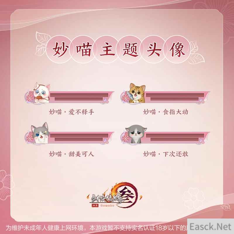 【萌指大动 “妙喵”主题头像登场】 乖巧却不失傲气的“喵主子”也来陪你共同迎接全新资料片的到来!四款头像“妙喵·爱不释手”、“妙喵·甜美可人”、“妙喵·食指大动”、“妙喵·下次还敢”各有千华,萌化无数侠士! “妙喵”主题头像将于4月28日上架商城,详情如下: “妙喵”系列头像礼盒内含四款头像(妙喵·爱不释手/妙喵·甜美可人/妙喵·食指大动/妙喵·下次还敢) 上架详情:4月28日7:00至5月30日7:00限时上架,售价30,000通宝,为不绑定款,不可使用折扣券。 礼盒内四款头像亦单独上架。 上架详情:4月28日7:00起永久上架,每款售价9,000通宝,为绑定款,不可使用折扣券。
