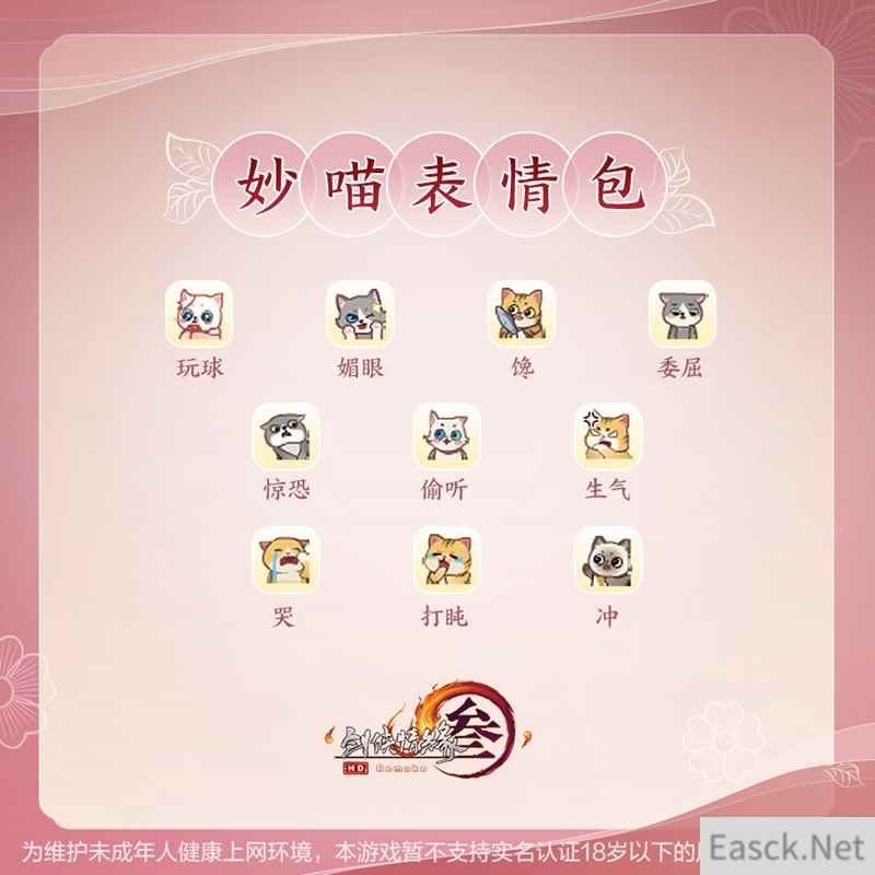 【“妙喵”新表情 萌游大唐江湖】 值得一提的是,还有超萌的“妙喵”表情包同步登场,挥挥小巧喵爪,江湖也要有本喵的印记哟! “妙喵”表情包将于4月28日上架商城,详情如下: 上架详情:4月28日7:00起永久上架,售价1,800通宝,为绑定款,不可使用折扣券。