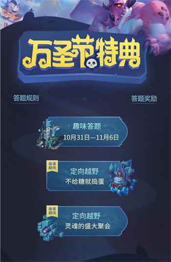 三大活动助力万圣节特典 万圣节趣味问答,后续玩法大爆料! 10月31日到11月6日期间正式服玩家可以在活动页面上参与趣味答题,回答正确即可获得密令奖励。趣味题目不仅有万圣节习俗相关的问题,还会有和游戏后续新玩法相关的问题,参加活动便可了解《不思议迷宫》近期的新动态和未来的新玩法,是不是很棒呢!