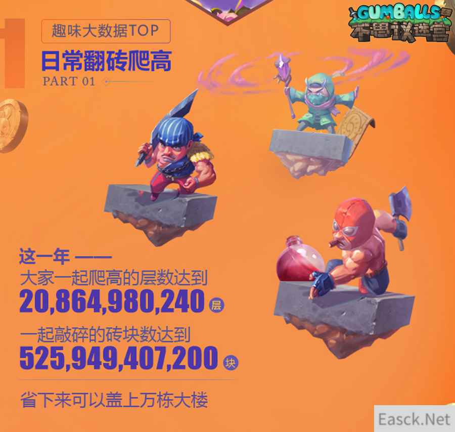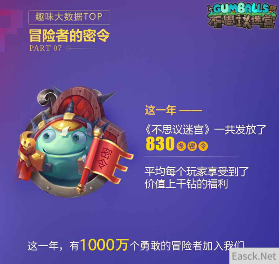 搞怪的开发组为冈布奥家族带来了游荡者之歌的新伙伴——“紫色萝莉”凯瑟琳冈布奥,作为埃拉西亚的核心主脑,凯瑟琳冈布奥掌控着一切机械生物,并在受到它们攻击时,能够实现减低其一定百分比的伤害。 当你在“肝爆”迷宫的途中进入60层后,每层4%概率出现一座十分坚固并用合金铸成的鸟笼,当你勇敢摧毁鸟笼后,你将会解救一名被关在此地很久的厉害法师猛禽冈布奥,让它一同加入你的冒险队伍。 庆生第二章:必看一周年趣味大数据 回顾过往,展望未来,这是冈布奥家族一直保持的传统。因此,在《不思议迷宫》一周年生日之际,冈布奥们费力统计了这一年的冒险趣味大数据,用数字带你重温那些不可思议的探索时光。 日常翻转爬高大调查,200多亿爬高层数记录下那些肝到爆的日日夜夜,5000多亿的敲砖大冒险,享受每次翻转的快感,让我们不断探索到埃拉西亚大陆的魅力新世界。