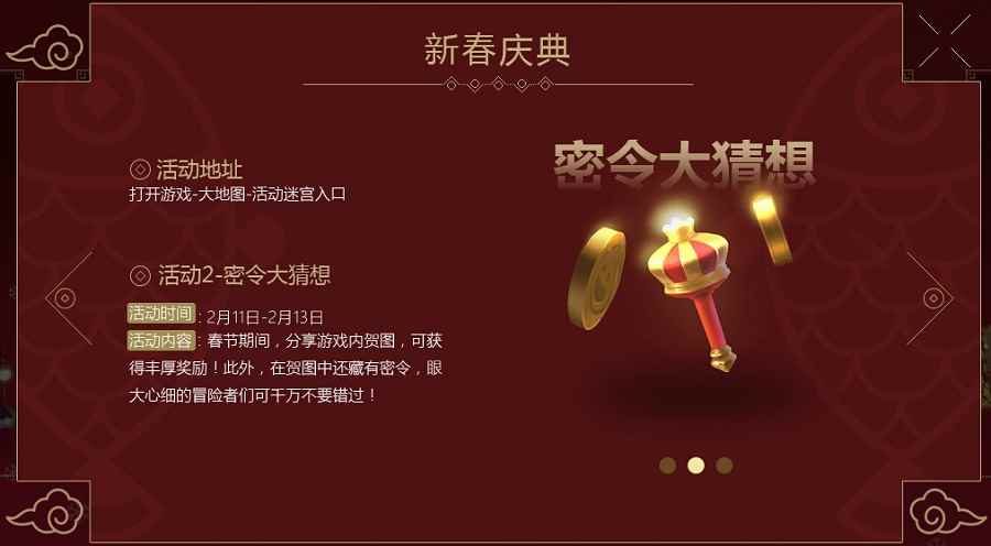 活动二“命令大猜想“透露出了冈布奥委员会的小心机,在春节期间,分享游戏内贺图便可获得丰厚奖励,考验各位冒险者眼力的时候到啦,快去贺图中寻找密令吧!