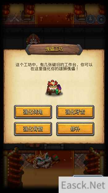 你还可通过击败迷宫的怪物获得彩布、竹蔑、铁块、金漆等道具,并利用傀儡工访中破旧的工作台,从而用以强化犄角、强化牙齿、强化骨骼、修补等来强化你的雄狮傀儡。