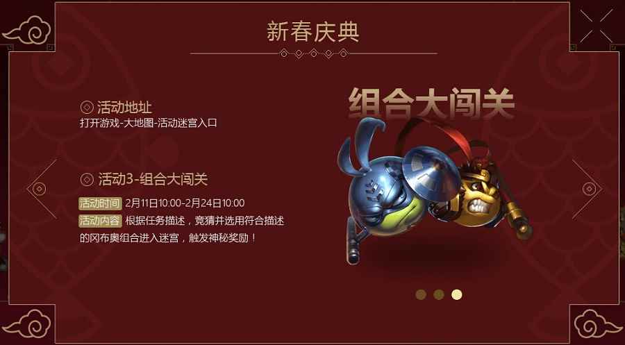 活动三”组合大闯关“以文字描述的竞猜形式,冒险者可选用符合描述的3只冈布奥进行组合闯关,不同的五个任务会触发不同的神秘奖励哦!