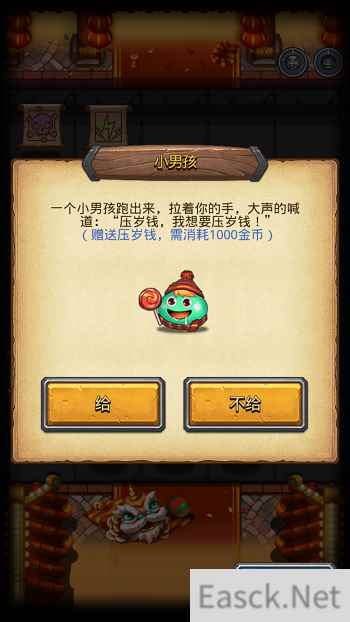 当你沉迷在新春迷宫战斗之时,你会意外的发现一个小男孩跑出来拉着你的手,大声喊道:“压岁钱,我想要压岁钱!”豪气的冒险者,你只需消耗1000金币,即可向小男孩赠送压岁钱。