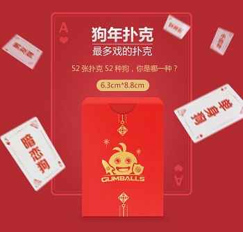 52张狗年扑克,张张戏精 冈布奥新春礼盒的一大重磅商品便是定制款狗年扑克,每一张都代表一种个性标签,不仅可供家庭娱乐,还可成为潮范十足的摆拍道具。有结合当下年轻人职场属性的营销狗、搬砖狗、程序狗......有深挖时下痛点的万年单身狗、加班狗、追番狗等等,可谓是张张扎心。总之,这是一副突破你想象力的扑克,期待各位小伙伴把它玩出新花样。