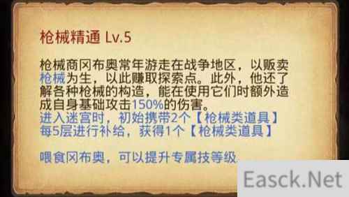 虽说失控状态下每轮都会损失生命值,但是相对应地提高攻击和魔力却非常实用。魔力值高了之后,每轮损失的15%的生命值,也许还没有暗影新星一口回血来的多。 因此在血量不足时,清空本层并拾取所有道具后,可以连续回血触发失控。让失控值清零,再进入下层,既能恢复生命值,又能清空失控值,简直就是机智本智。 奸商本商的——枪械商冈布奥