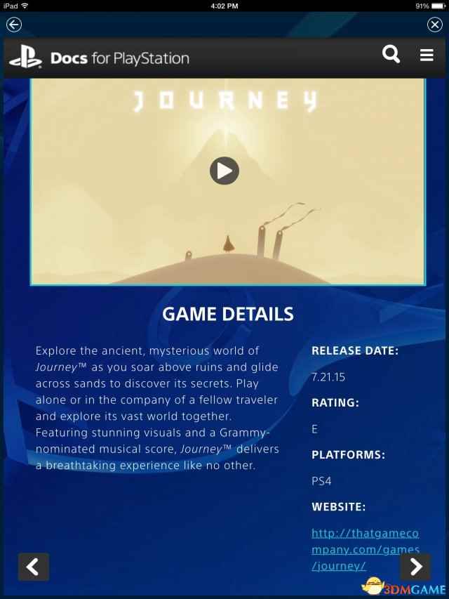之前PS3平台由Thatgamecompany开发,备受好评的独立游戏《风之旅人》即将于7月21日登陆PS4平台。该游戏的页面信息目前已经贴出,上面写道新版本登陆平台为PS4,发行日期为21日。 这款游戏原本发行于PS3平台,游戏中玩家加扮演身着长袍的旅人徒步穿越沙漠。该作品中允许其他玩家加入到你的游戏中来协助完成旅途,虽然你无法知道对方的名字,也无法同对方交流。