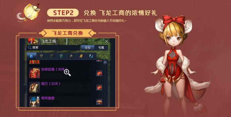 STEP2兑换 飞龙工商的浓情好礼 使用水蛙族巧克力,即可在飞龙工商处兑换情人节浓情好礼~