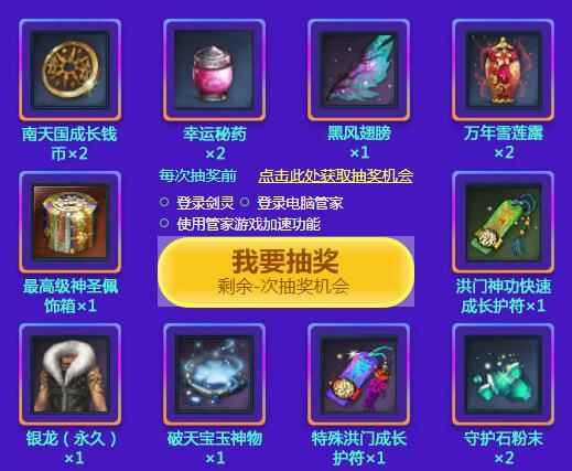 四、管家达人 玩转大转盘 转盘规则: 1.当天登录剑灵+1 2.当天登录电脑管家+1 3.当天同本页面登录的QQ号使用管家游戏加速一键优化功能+1 4.所有获取转盘机会方法,单Q单日限一次,抽奖机会零点清零。 TIPS: 1.使用加速功能:建议使用IE浏览器,如使用其他浏览器, 可按照页面弹窗说明进行操作。在启动加速前,请把所有浏览器相关的勾选去掉 2.获取抽奖机会:如使用加速功能后无法获取抽奖机会,请在本页面下载管家后重新登录, 然后在页面上尝试再次获取可。