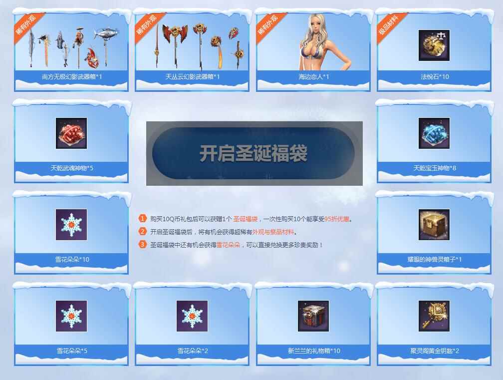 活动规则: 1、10Q币购买1个聚灵阁黄金钥匙+1个洪门神功快速成长护符,获赠1个圣诞福袋开启机会; 2、95Q币购买10个聚灵阁黄金钥匙+1个特殊洪门成长护符,获赠10个圣诞福袋开启机会; 3、开启圣诞福袋,将有机会获得雪花朵朵,使用一定数量雪花朵朵可以在本页面中兑换道具。雪花朵朵仅限在本页面活动中使用; 4、本次活动圣诞福袋开奖概率请点击查看 ,枪手的天丛云幻影武器目前汉化错误为“武士幻影枪” ; |