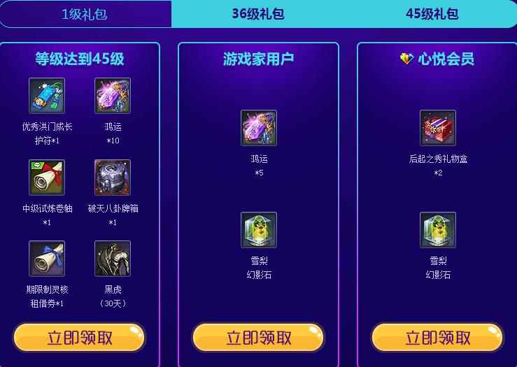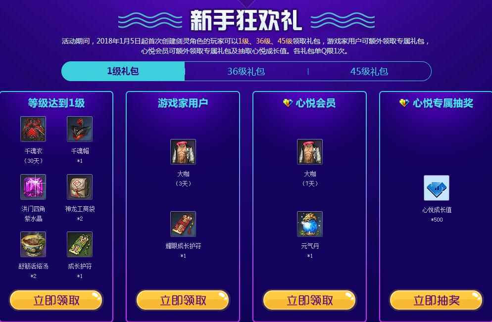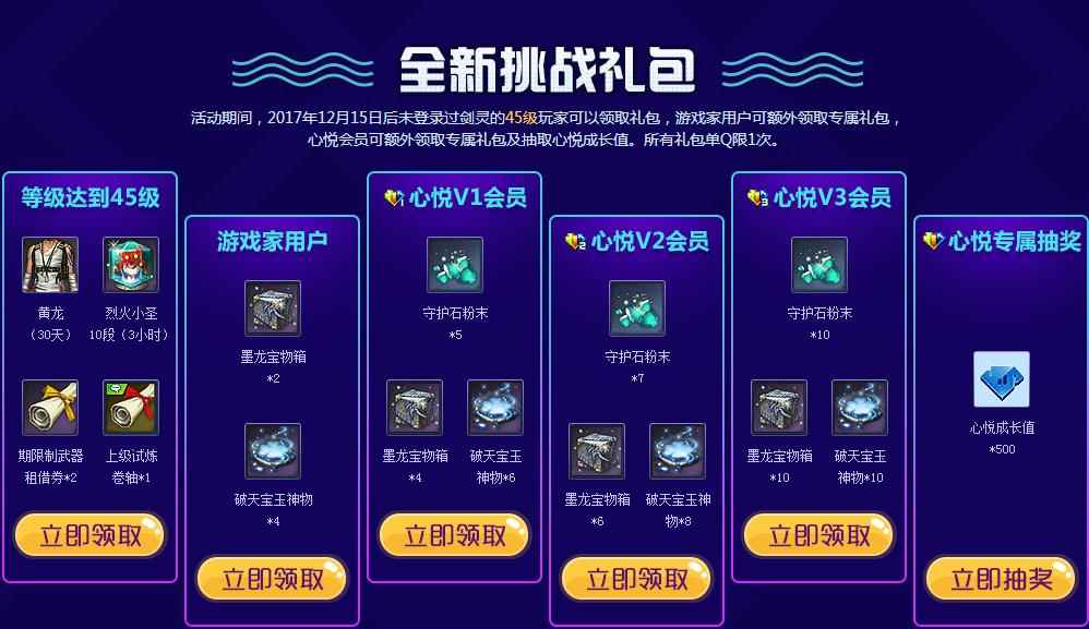 全新挑战礼包: 活动期间,2017年12月15日后未登录过剑灵的45级玩家可以领取礼包,游戏家用户可额外领取专属礼包, 心悦会员可额外领取专属礼包及抽取心悦成长值。所有礼包单Q限1次。
