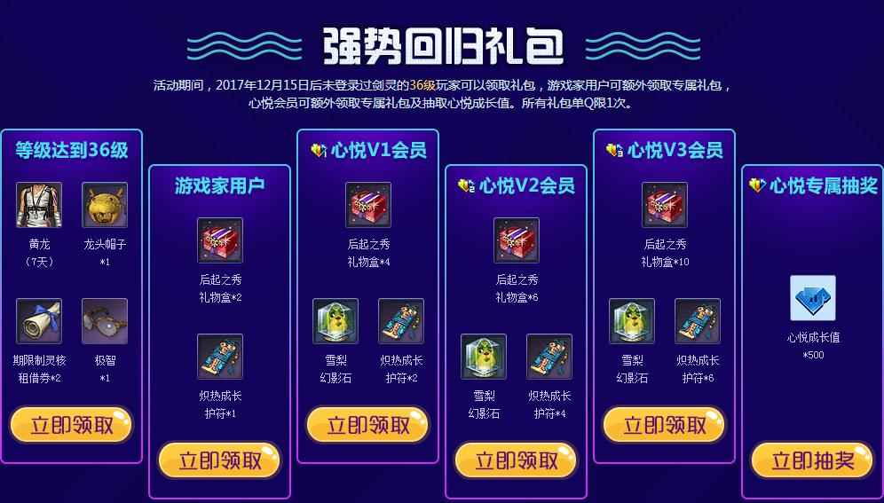 强势回归礼包: 活动期间,2017年12月15日后未登录过剑灵的36级玩家可以领取礼包,游戏家用户可额外领取专属礼包, 心悦会员可额外领取专属礼包及抽取心悦成长值。所有礼包单Q限1次。