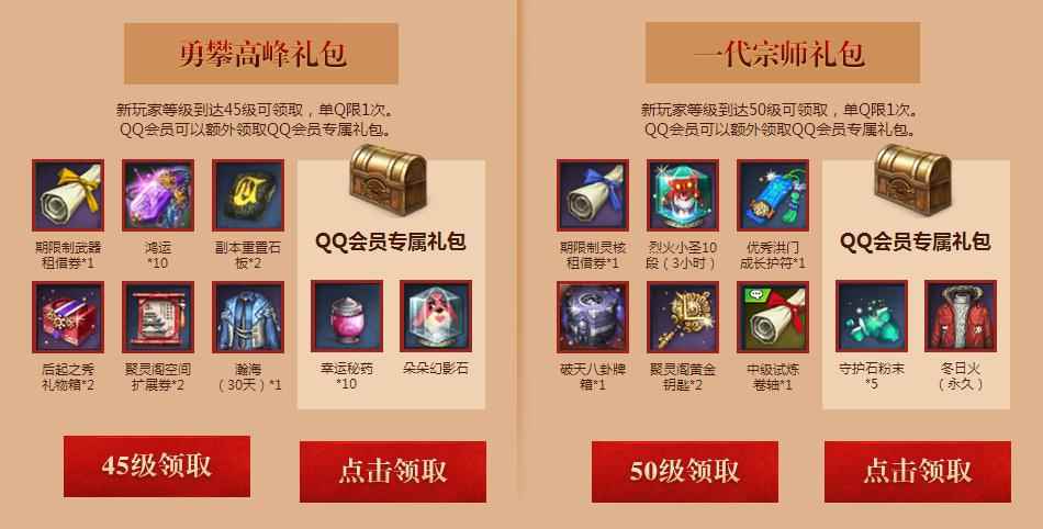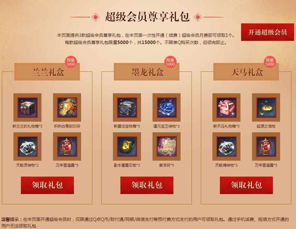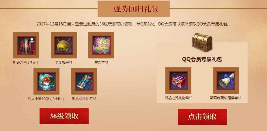 剑灵2018火龙娘QQ会员助力活动指南 活动时间:2018.01.02-2018.02.28 活动地址:http://bns.qq.com/cp/a20160412vip/index.htm 活动规则 1、活动期间,2018年1月2日起首次创建剑灵角色的玩家可以领取剑灵新手礼包,到达36级可领取冲级达人礼包,到达45级可领取勇攀高峰礼包,QQ会员可以额外领取QQ会员专属礼包;到达50级可领取一代宗师礼包,QQ会员可以额外领取QQ会员专属礼包。所有礼包单Q限1次。 2、活动期间,2017年12月15日后未登录过剑灵的36级玩家可以领取强势回归礼包,到达45级可领取再战巅峰礼包,QQ会员可以额外领取QQ会员专属礼包;所有礼包单Q限1次。 3、所有剑灵玩家,活动期间玩家邀请1好友领取新玩家礼包抽奖+1,邀请1名好友领取老玩家礼包抽奖次数+2,玩家活动期间累计的总抽奖次数达到5次,即可获得秦义绝终极宝箱一份。邀请好友必须为7天以上QQ好友关系。好友邀请最多获得10次抽奖机会。 4、本页面提供3款超级会员尊享礼包,在本页面一次性开通(续费)超级会员月费即可领取1个。每款超级会员尊享礼包限量5000个,共15000个。不限单Q购买次数,但领完即止。(温馨提示:在本页面开通超级会员时,仅限通过Q点Q币/财付通/网银/微信支付等预付费方式支付的用户可领取礼包。通过手机话费、短信方式开通的用户无法领取礼包) 5、在修炼场55级角色无法参与本次活动,请离开修炼场后尝试领取礼包。 活动奖励一览: 新玩家秒升55