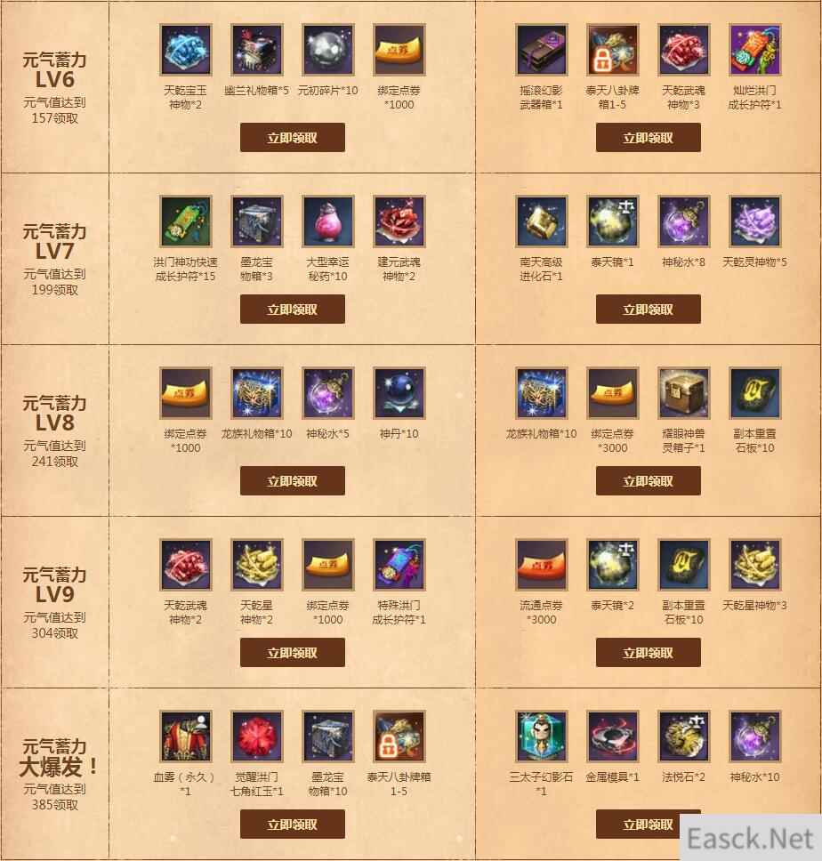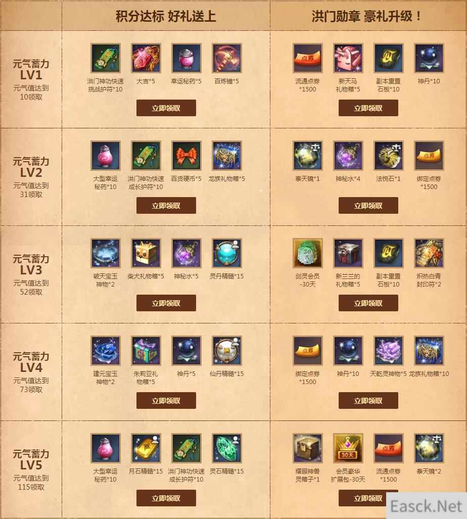 二、元气好礼 洪门勋章再升级! 活动期间,达到指定元气值即可获得元气好礼~在活动页面购买洪门勋章,豪礼将额外升级!