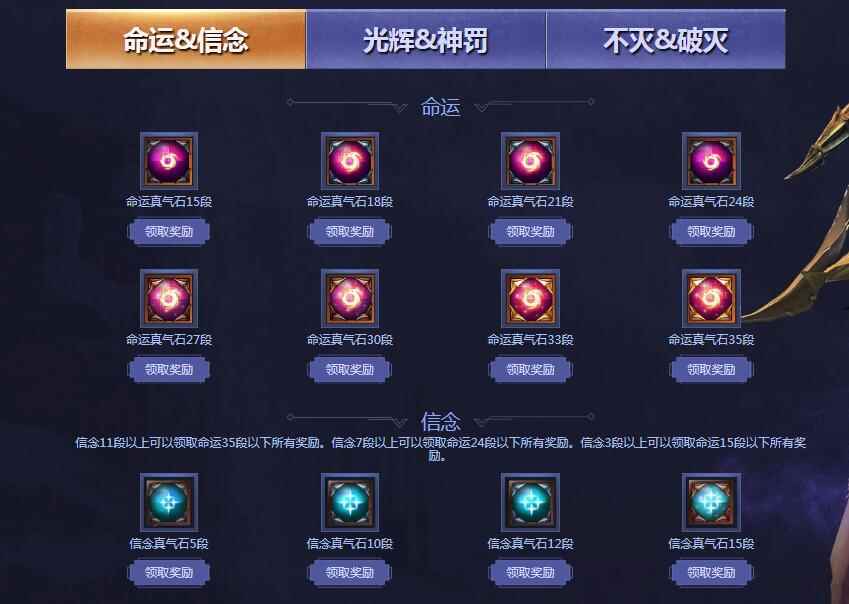 三、真气石 1、将真气石拆下放入背包后再领取奖励 2、满足条件时仅能领取上一代的奖励,无法隔代领取。