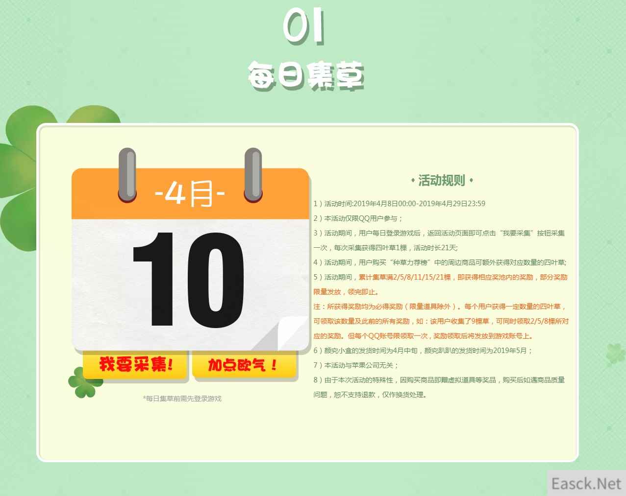 《剑灵》欧皇四叶草 每日集草赢绝版时装 活动时间:4月8日~4月29日 活动地址:https://mall.qq.com/act/a20190401syc/index.html?from_ol.3dmgame.com 活动内容: